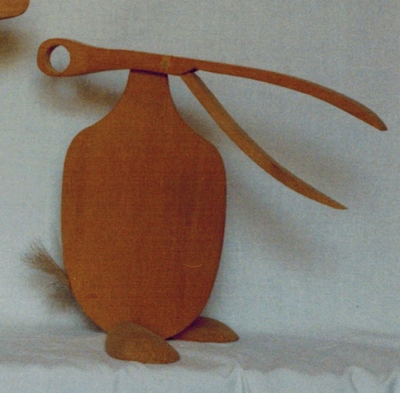 Description: This penguin is made from wood pieces. It has tongs that make up the head, eye, and open mouth. The body is an oval shape that peaks at the top into a neck. The feet are two little cone like shapes. The tail is a small bit of fur.