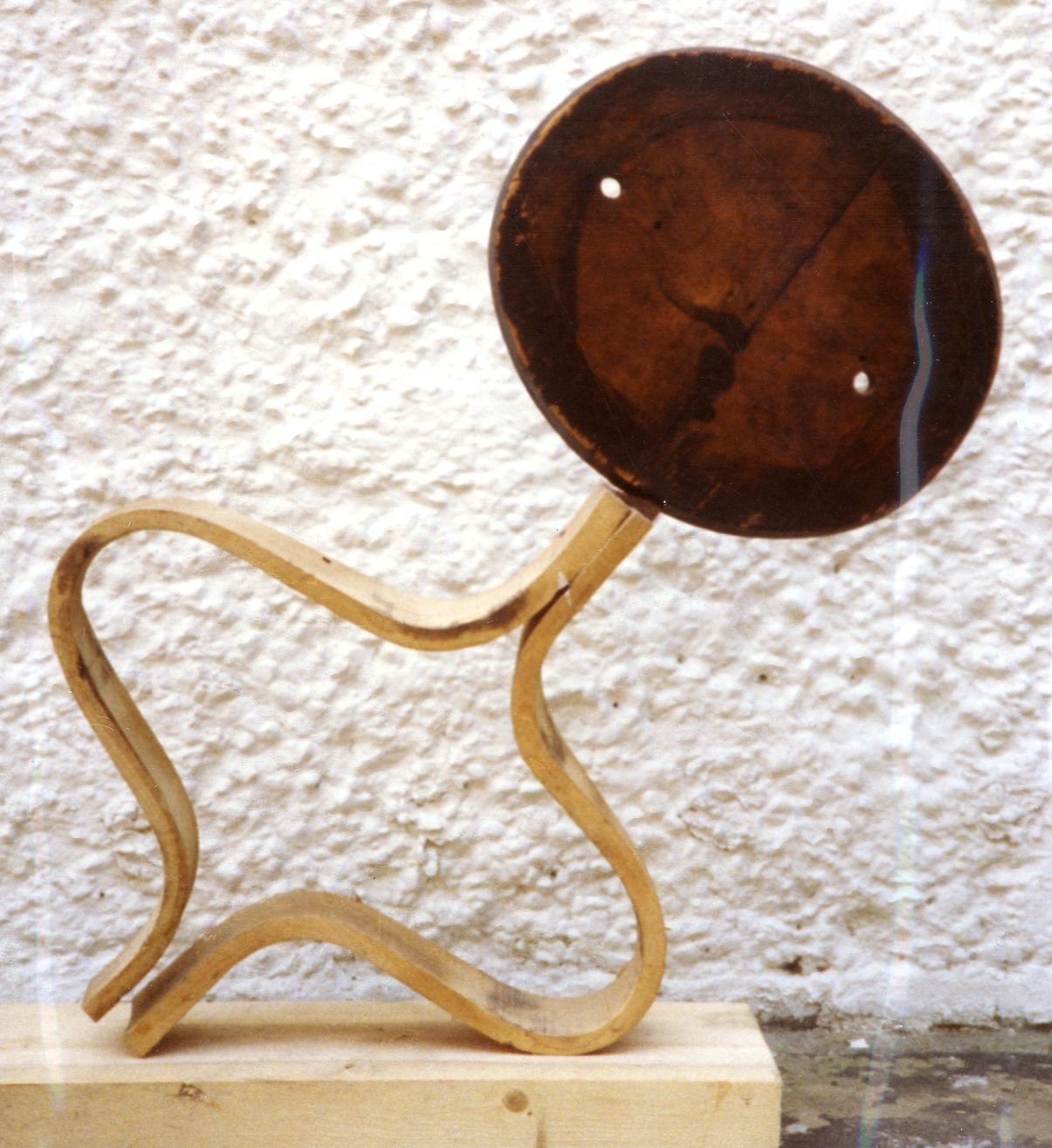 Description: A blonde, rectangular block of wood serves as the base for this piece. Two open wooden loops are attached atop of the base, meeting at their ends. One set of ends is near the base of the piece, while the other set points up at an angle. A dark wooden disc with two punched holes is attached to the ends of the loops that point up.