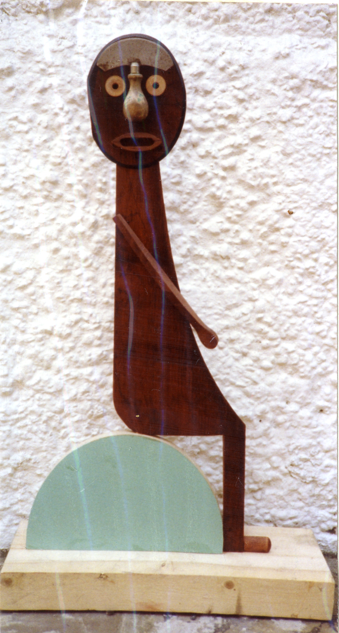 Description: A person is shown sitting in profile. The piece rests on a blonde, rectangular piece of wood. A light teal half circle sits atop this, serving as a seat for the figure. This figure is comprised of a long, triangular torso which rests on the seat. Short, rectangular legs emerge from the front bottom, meeting small feet which rest on the base. Short, thin arms rest by the figure’s side. The figure’s head rests directly atop their torso. Small wooden forms are attached to the face, representing a surprised face, turned towards the viewer.