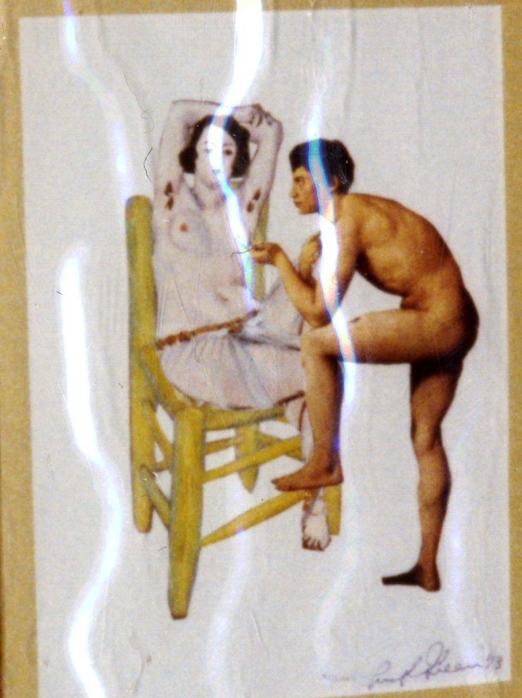 Description: This piece shows two similarly-scaled figures engrossed in conversation. An unidentified female figure sits on Van Gogh’s yellow chair (Van Gogh’s chair, 1888, Vincent can Gogh, Dutch, Zundert 1853-1890 Auvers-sur-Oise, The National Gallery). She wears only a small white cloth around her waist, and crosses her left leg atop her left. Her arms are braced behind her head. The unidentified male figure stands on his right leg, his left leg bent forward, foot resting on the bottom run of her chair. He’s leaned over his left leg, towards her, with his left elbow resting on his knee. The two figures are aligned as if making eye contact.
