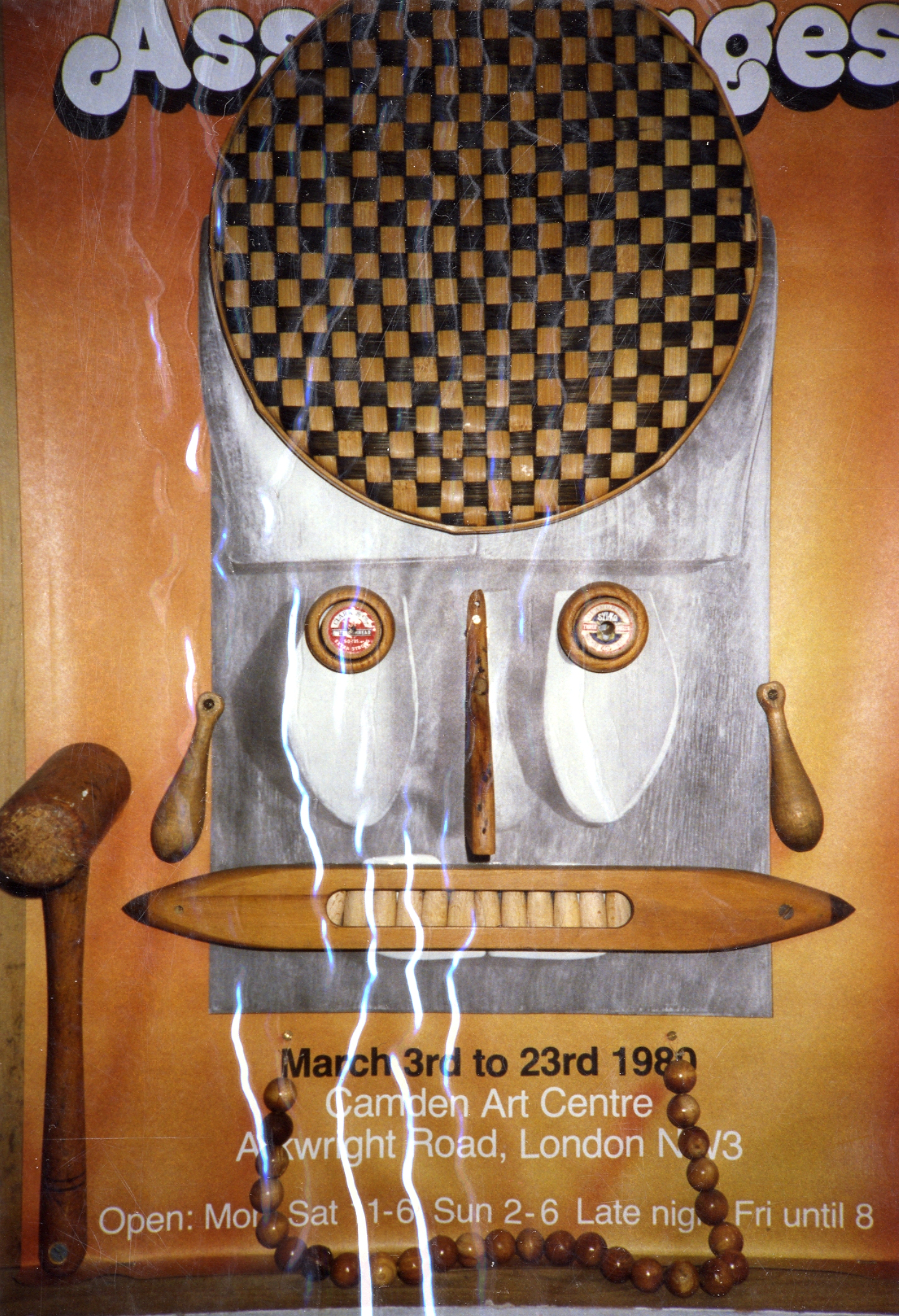 Materials and Techniques: Poster from Norman’s show, wood cogs, paper cut out, wood knobs, weaving shuttle, mallet, wood necklace, cork