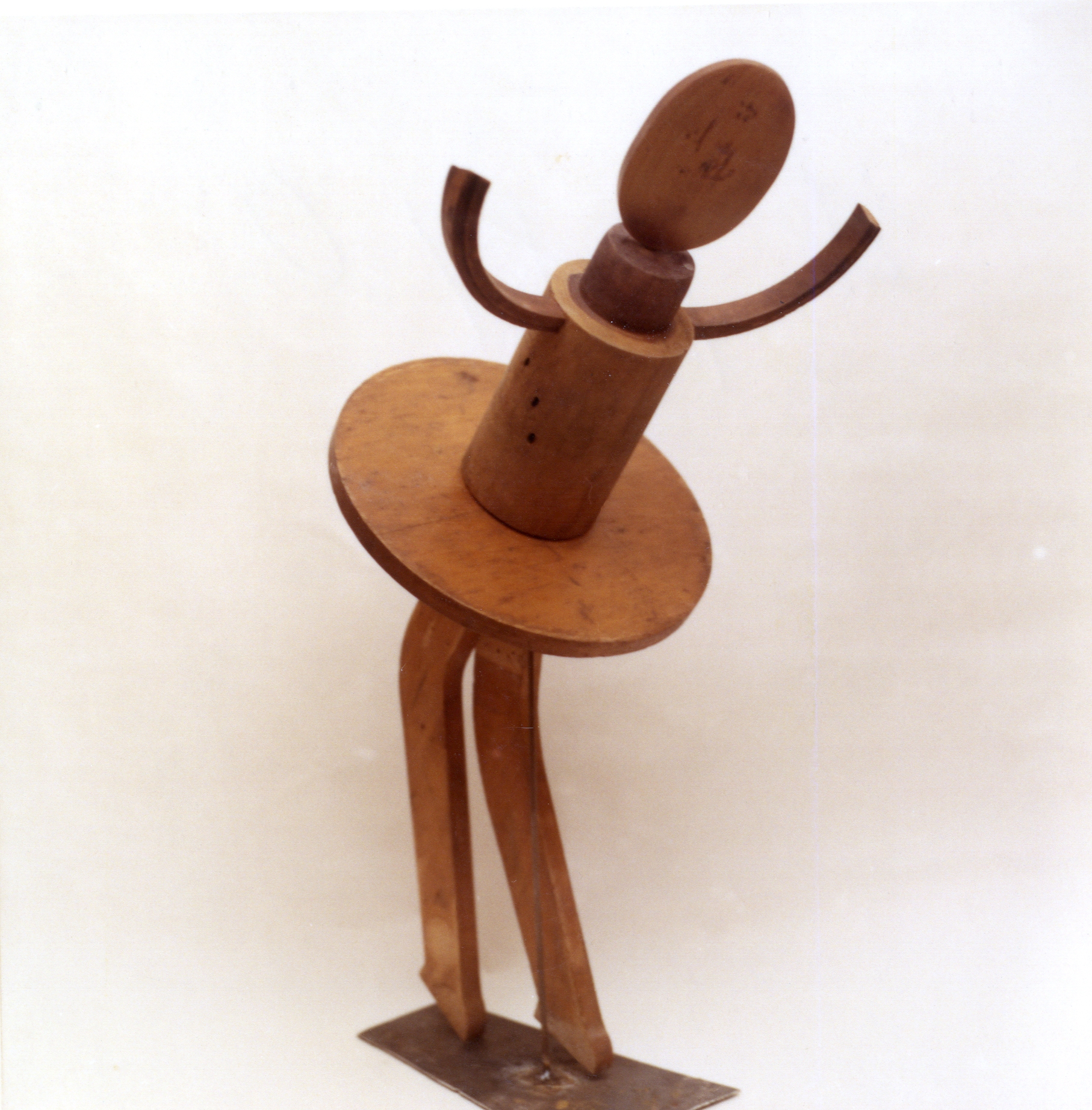 Description: This piece resembles a ballet dancer wearing a tutu, leaning forward with arms up in 5th position. It is made from several wood pieces of the same dark natural wood color. Two long pieces make up the legs. The tutu is a flat wood cog. The body and neck are long tube shaped wood cogs. The head is a flat oval piece, and the arms are two curved thin wood pieces. It is mounted to a flat piece of metal as the base.