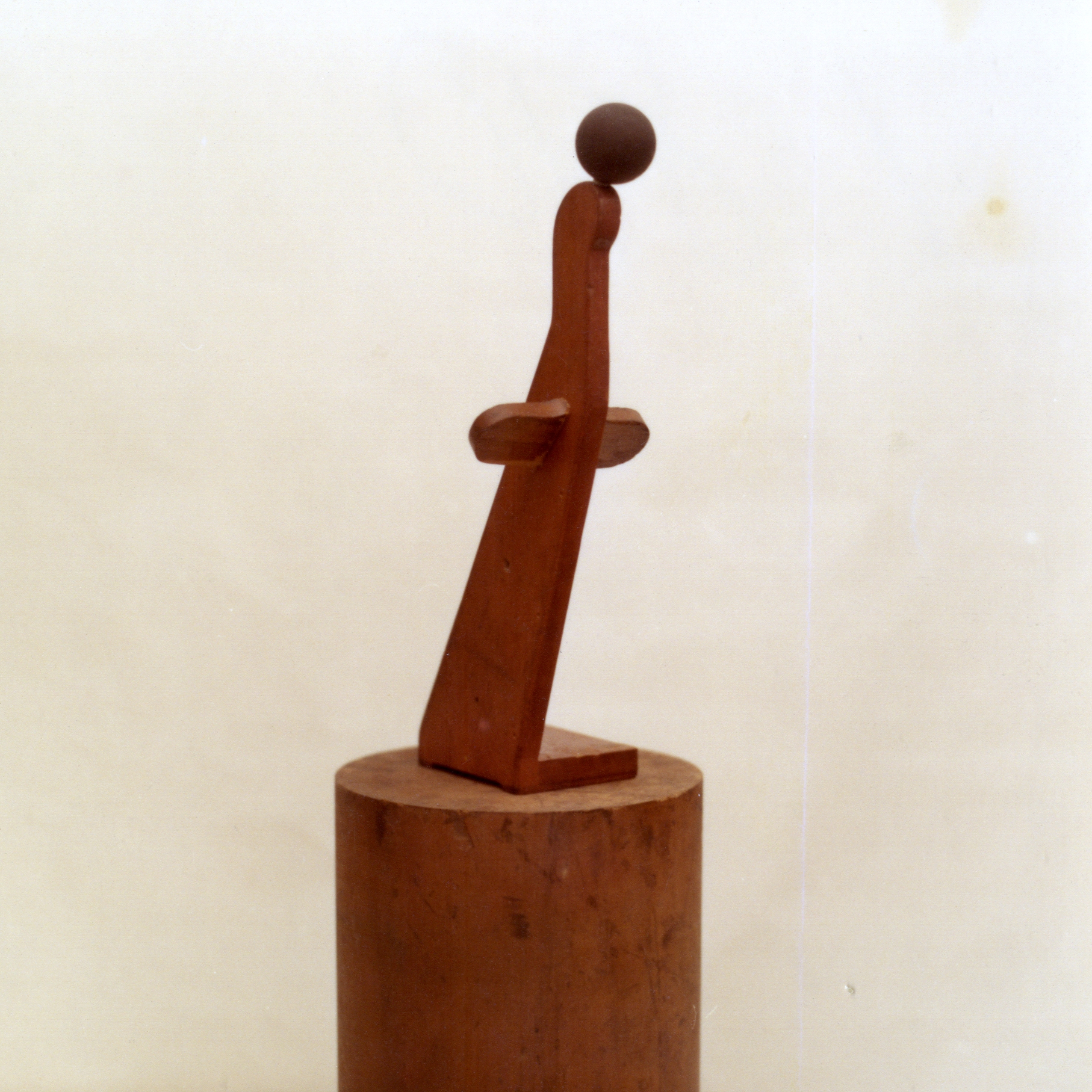 Description: This piece is mounted to a large tube wood cog. A figure is made up of one long piece of wood. It gets wider at the bottom to resemble a dress. A sphere at the top represents a head. The figure is leaning forward, giving the illusion that it’s looking down, bowing her head. Two large wood pieces extend from her middle, resembling wide sleeves or hips.
