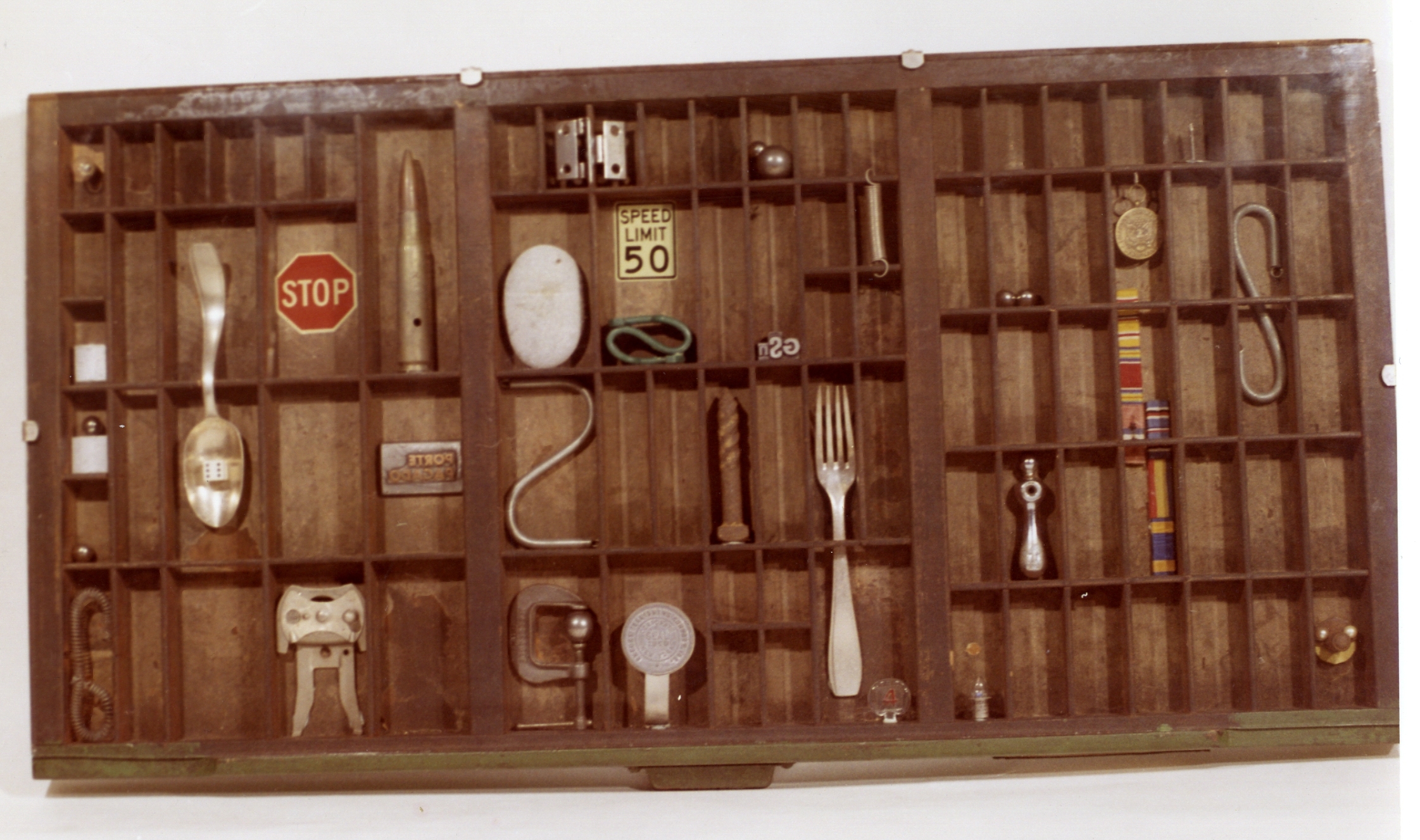 Materials and Techniques: Collectible shelf, metal S hooks, fork, spoon, stop sign, speed limit sign, hinges, marble, clamp, lock,