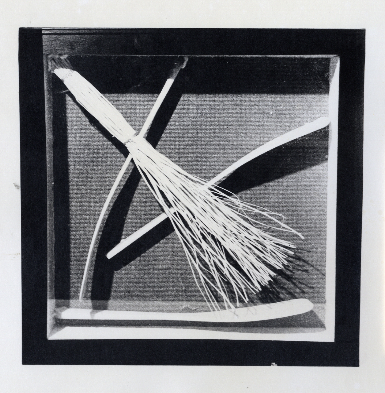 Description: Inside a wood frame shadow box is the bottom of a broom. It reaches diagonally across from the top left of the frame to the bottom right. Three long thin wood pieces cross the opposite direction, spread out evenly from the bottom left to the top right.