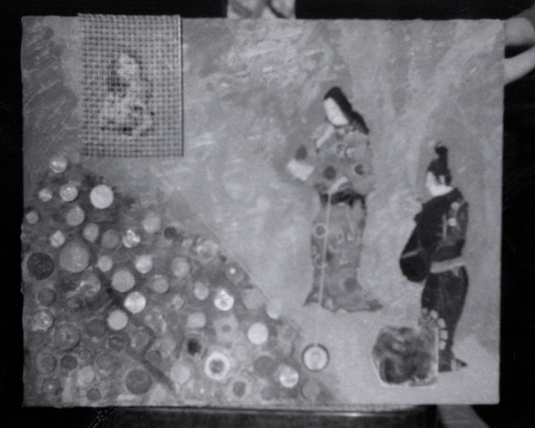 Description: This piece is a 2D collage mounted to a board. It depicts two Japanese women dress in a traditional Kimono. They have their head downcast as if in prayer. A giant leaf takes up the bottom right side of the composition. It is adorned with beads and money. In the top left is a portrait of a young woman, overlaid with a square transparent fabric piece.