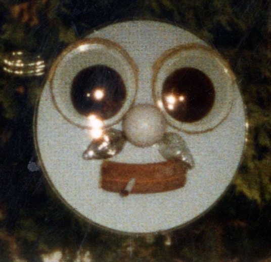 Description: This sculpture is a 2D wall mounted face. It is light blue in color. The face has large googly eyes. A round white nose, two metal decorative leaves as a mustache, and two wood pieces for lips. A small cigarette is between its lips.