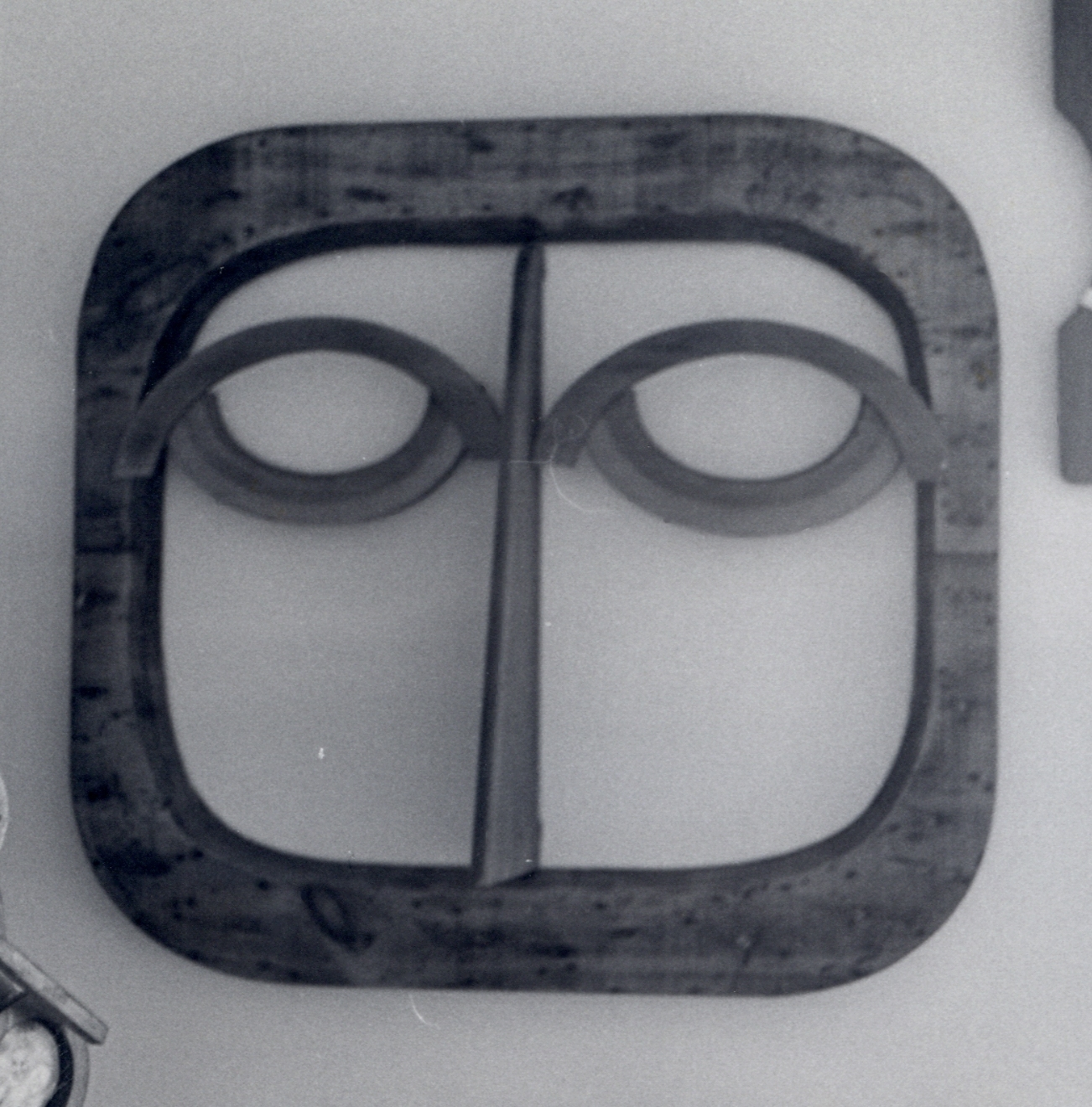 Description: This sculpture is a 2D wall mounted face. It is a hollow, curved rectangular frame. Inside are two eyes and a long thin nose that reaches from top to bottom. The eyes are a hooded shape that suggested sleepiness. Two thin pieces make up the bottom of the eye, resembling under eye bags.