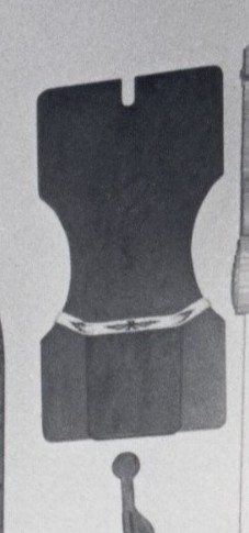 Description: One solid shape resembles a female figure’s torso. It is a flat, 2D wall mounted shape. A thin decorated strip is around the waist, like a belt.