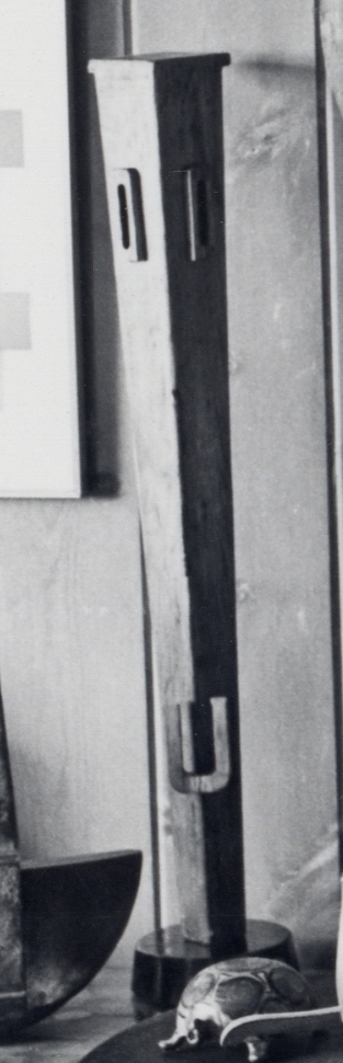 Description: This sculpture is a 3D long thin, rectangular wood piece. It gets wider towards the top. On two sides of the rectangle there are squares representing eyes. The bottom has a U shape that makes the mouth.