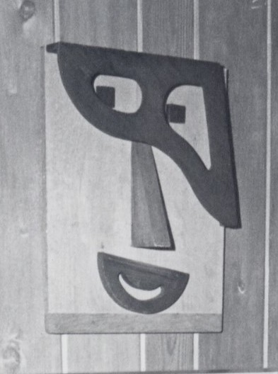 Description: This 2D wall mounted sculpture is a face. It consists of a flat wood board with small wood pieces as eyes, a long nose, and a smiling, tilted mouth. Over the eyes is an eye mask.