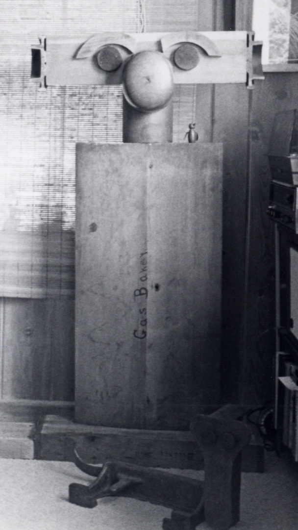 Description: This 3D figure has a large rectangular block body mounted to a wood board. The neck is a thin wood cylinder. The nose is large and spherical. It hands down from its horizontally positioned rectangular face. It has two eyes, two curved eyebrows, and ears. A small bird sits on its shoulder.
