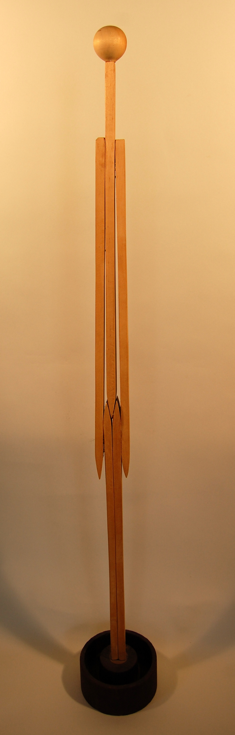 Description: A cylindrical wooden form stained black serves as the base for this image of a girl in a standing position. Five long, thin wooden forms comprise the body. Two forms represent legs, one represents the torso and neck, and two represent arms. All five pieces are placed vertically. A round wooden form representing the head is placed atop the wooden form representing the torso and neck.