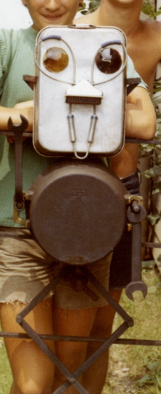 Description: This robot looking figure has a large, flat metal head. On his face are two eyes with eyebrows, a triangular nose, and a wire mouth that hangs down in a large smile. The body is a round metal pan, its legs are extended tongs, as if squatting. His arms are wrenches.