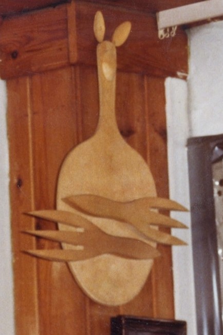 Description: This creature is a 2D wall hanging. He is made from a pizza peel, the handle is the head and neck and the peel is the body. The creature has two large pitchfork hands across its belly. He has long vertical ears and large smile.