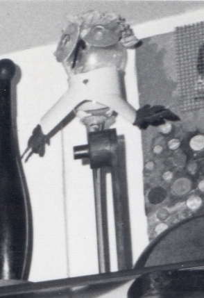 Description: This owl like person has a face like a bird and a long thin body. A lightbulb is the head and body, wooden cogs and dowels are the hips and legs. The arms extend outward with leave like hands. The face has a hair like material on top and the face has large, owl like eyes with a long thin beak.