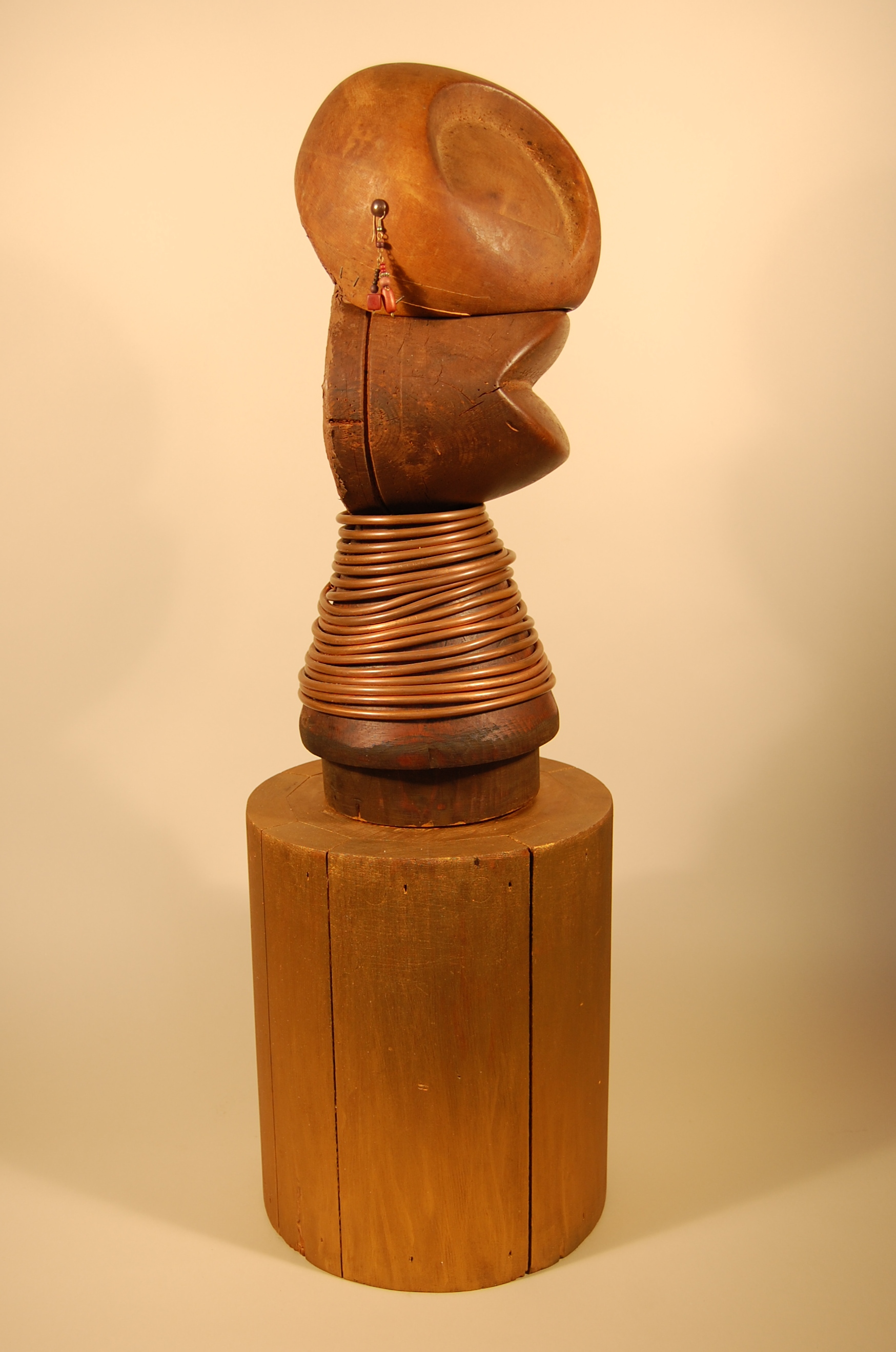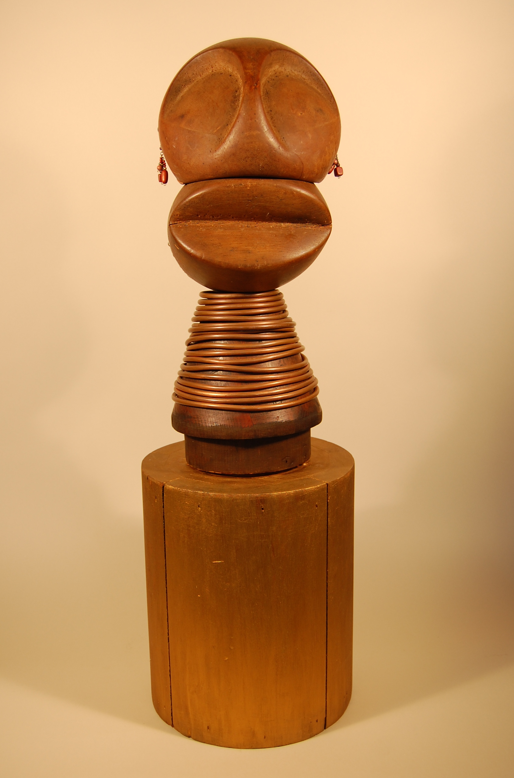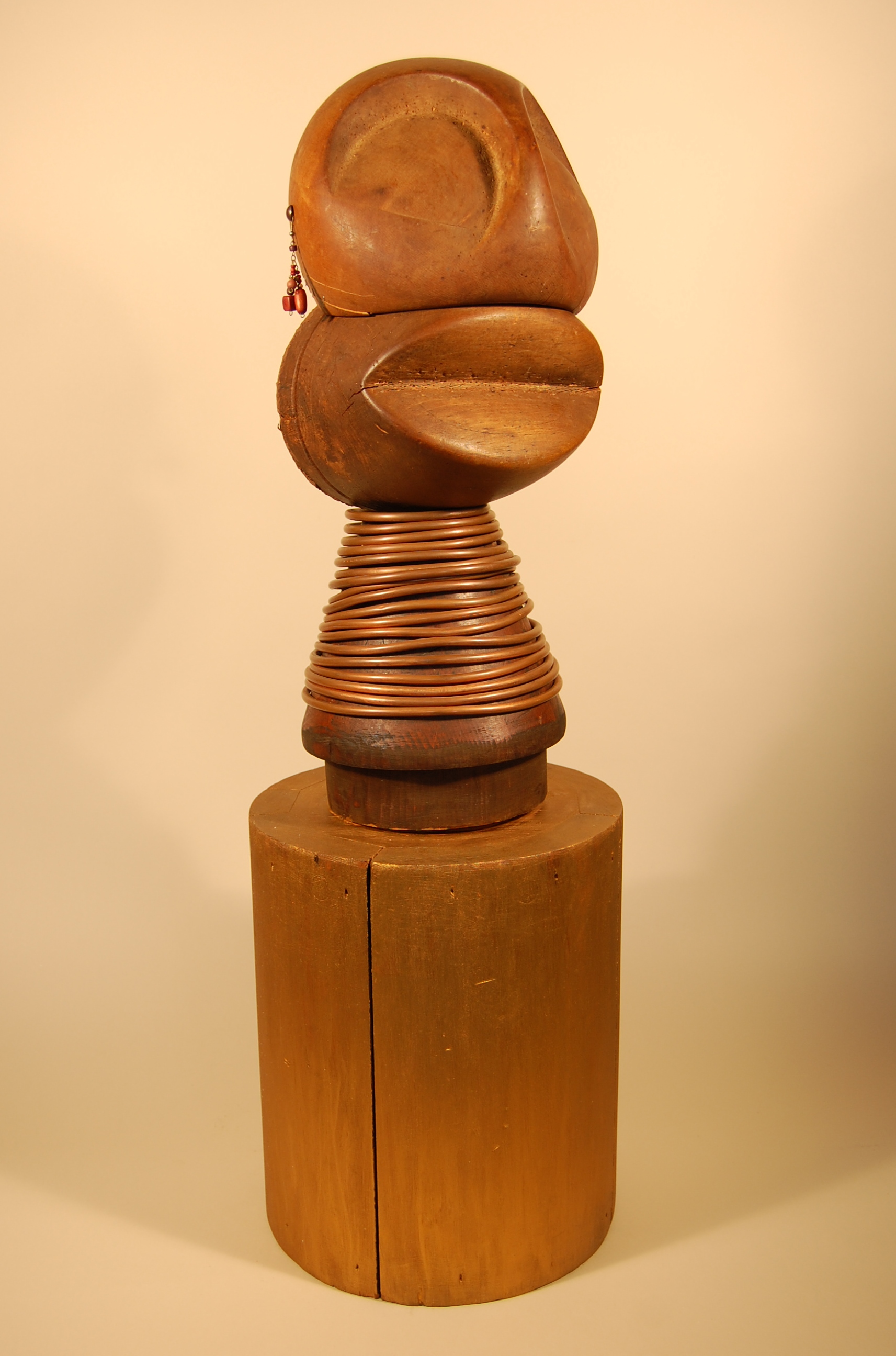 Description: The bust of an African tribal woman rests on top of a cylindrical, wooden form painted gold. She is represented with three wooden forms stacked on on top of the other. The first wooden form narrows towards its top, representing her neck. Brass coils wrap around this form in the style of a tribal necklace. The next wooden form is flat on the backside and curved towards the front. The center of the front side is carved into the shape of large lips. This form represents the lower half of the woman’s face, which is dominated by her lips. The wooden form that rests on top has two identical, round indentations on both sides of its curved surface. These carvings represent the woman’s eyes, and the central wooden surface that is not indented represents her nose. Earrings with small wooden beads dangle from both sides of her head, suggesting pierced ears.