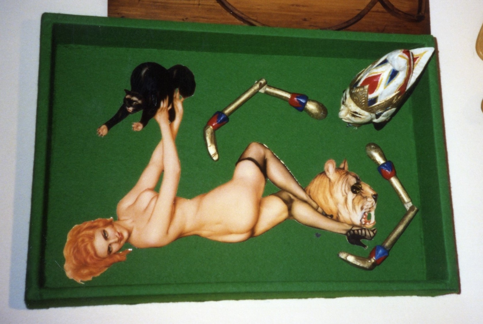 Description: This 2D wall mounted sculpture is a green wooden frame with two people inside. Cut from a found image, a woman lays on her back holding a cat in the area. A tiger head is at her feet. In the top right is a 3D jester head with two metal arms extending towards the bottom of the woman.