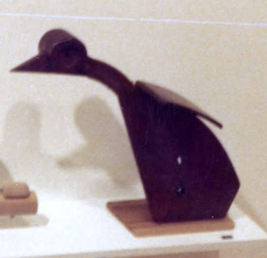 Description: This piece resembles a penguin made from various wood pieces of different sizes. The body is a large wood panel. The neck is long and thin, the head is circular with a hollow dot carved out in the middle. The beak is a pointed triangle. The wing rests on the back on the body and is a curved flat piece.