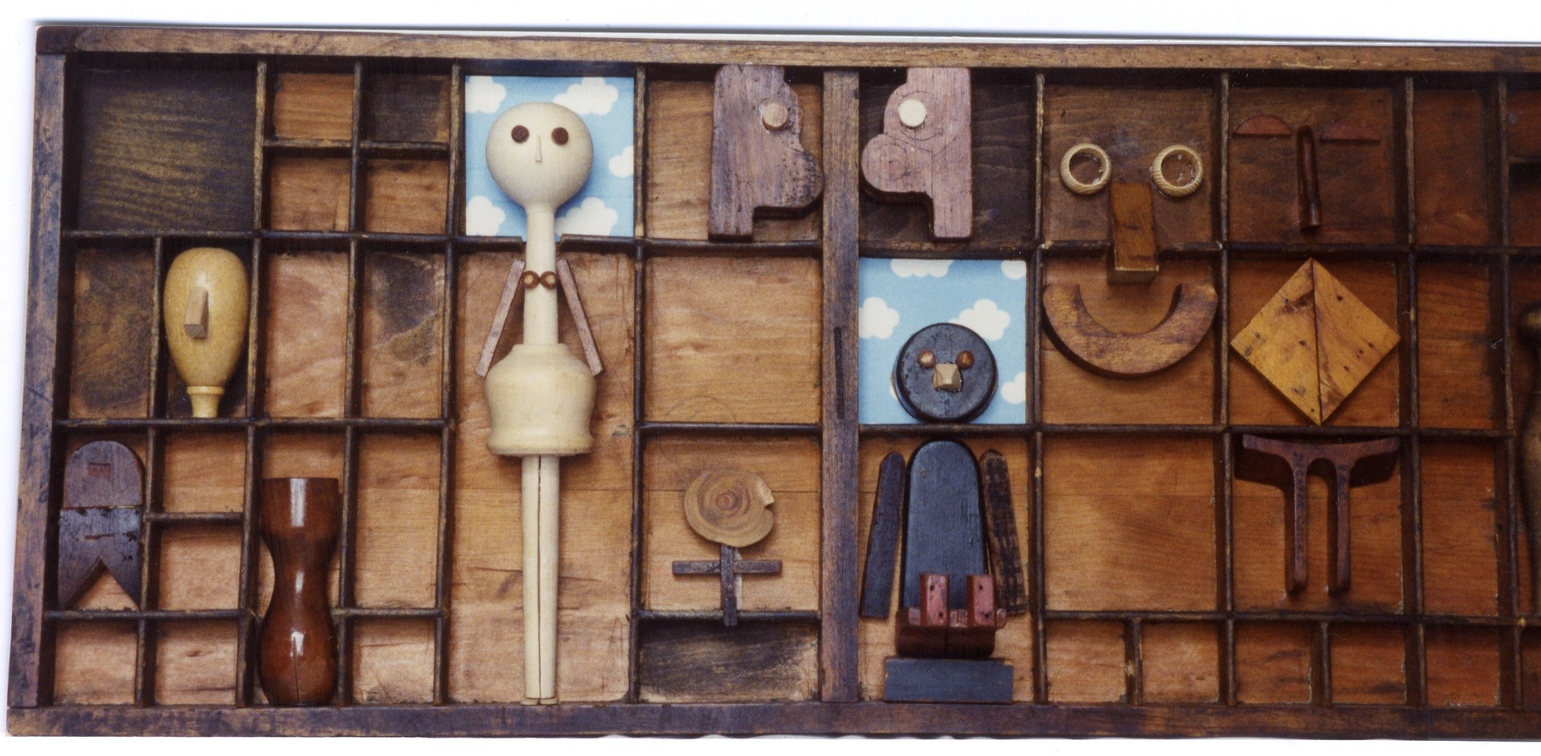 Description: Inside different compartment shelves are various faces and figures of different sizes, shapes, and colors. Two full figures, a man and a woman, are near the center. The woman is tall and standing. Behind her head is a paper sky with clouds. The man is sitting, with the same paper sky behind his head. Above him are two faces facing one another. A smiling face is to the right, as well as various wooden forms filling up three compartments. To the left of the woman are three forms. One is recognized as a face with a nose. Between the figures is a small literal stick figure from the waist up.