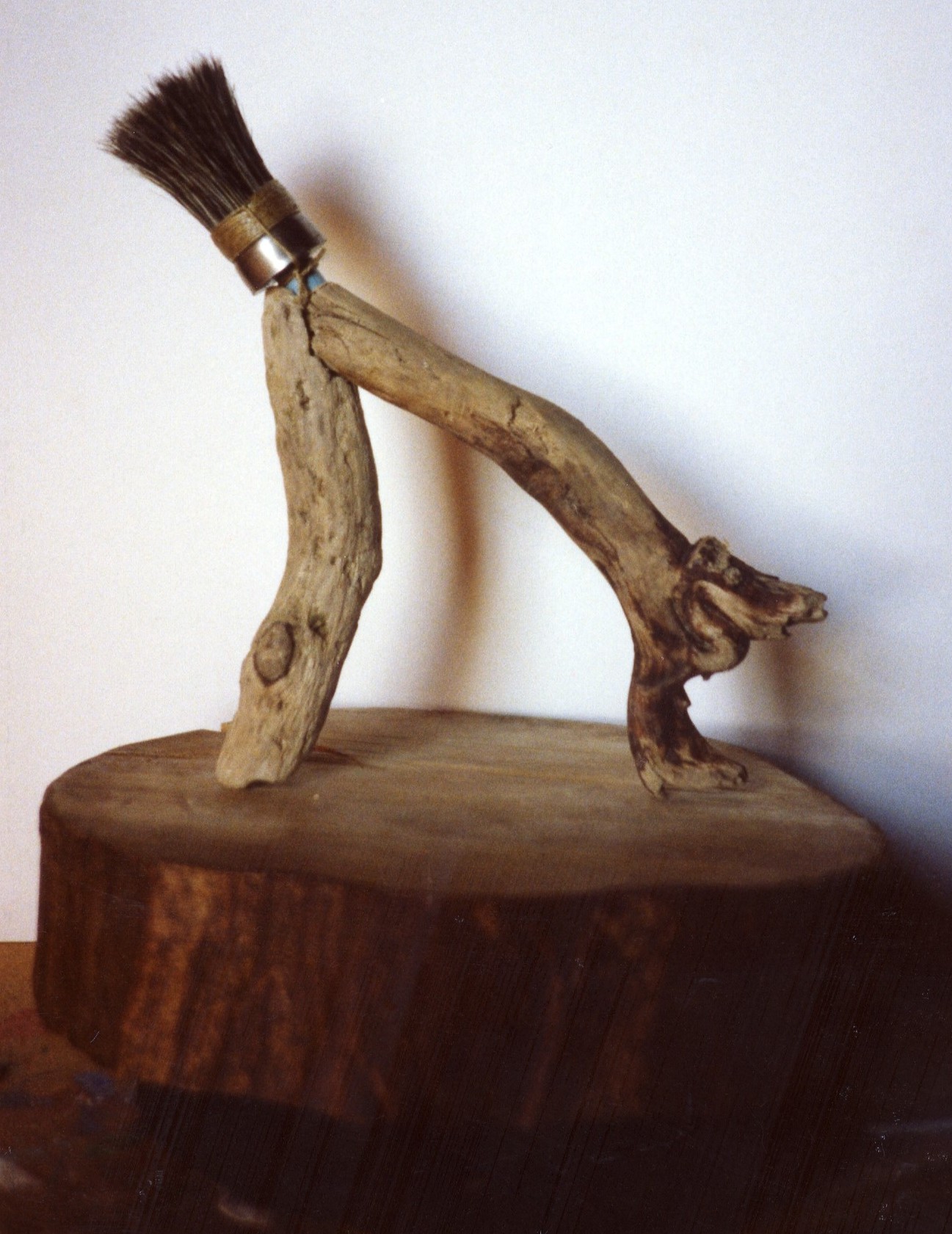Materials and Techniques: organic wooden branches, brush, organic tree trunk slice.