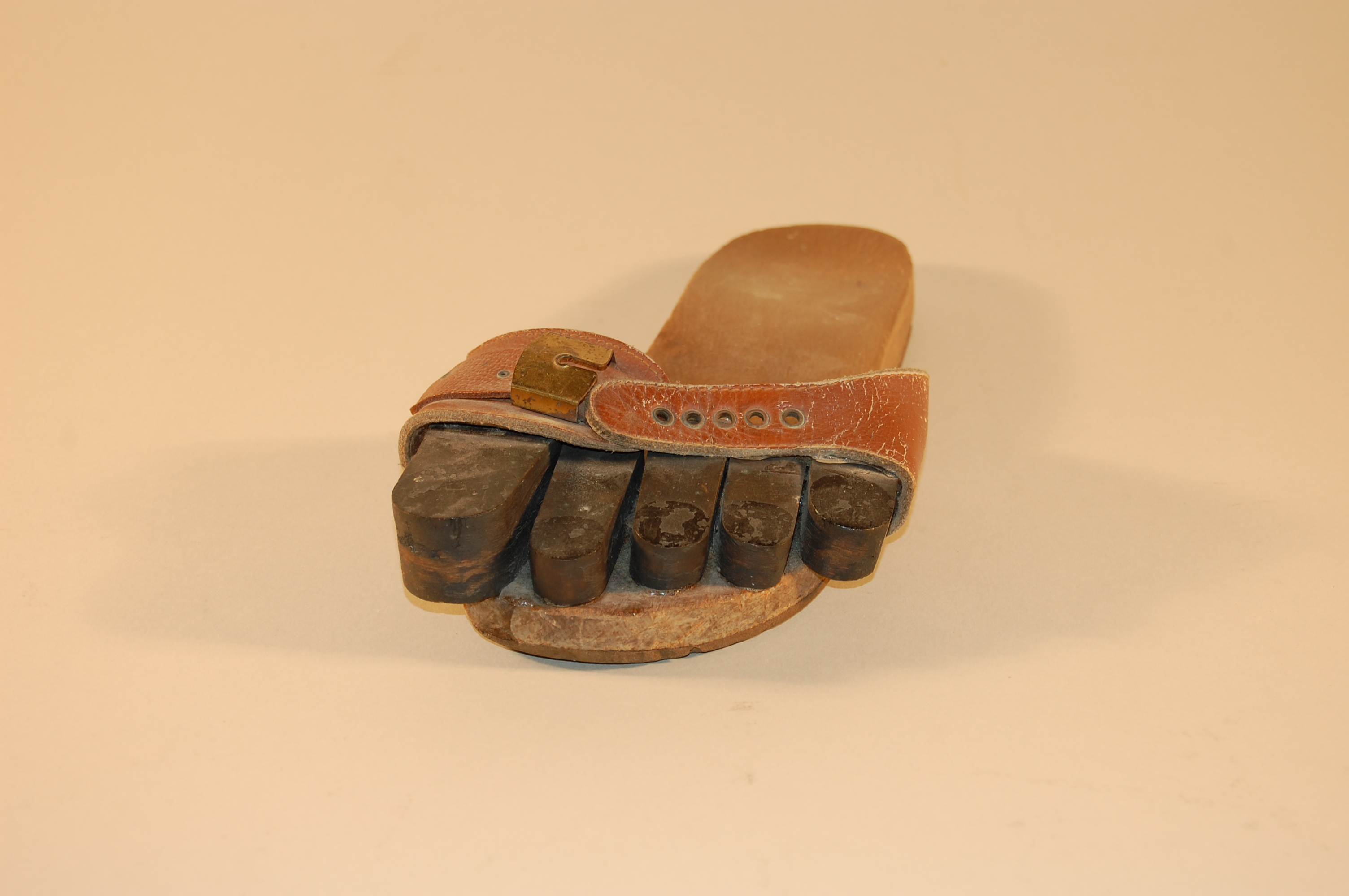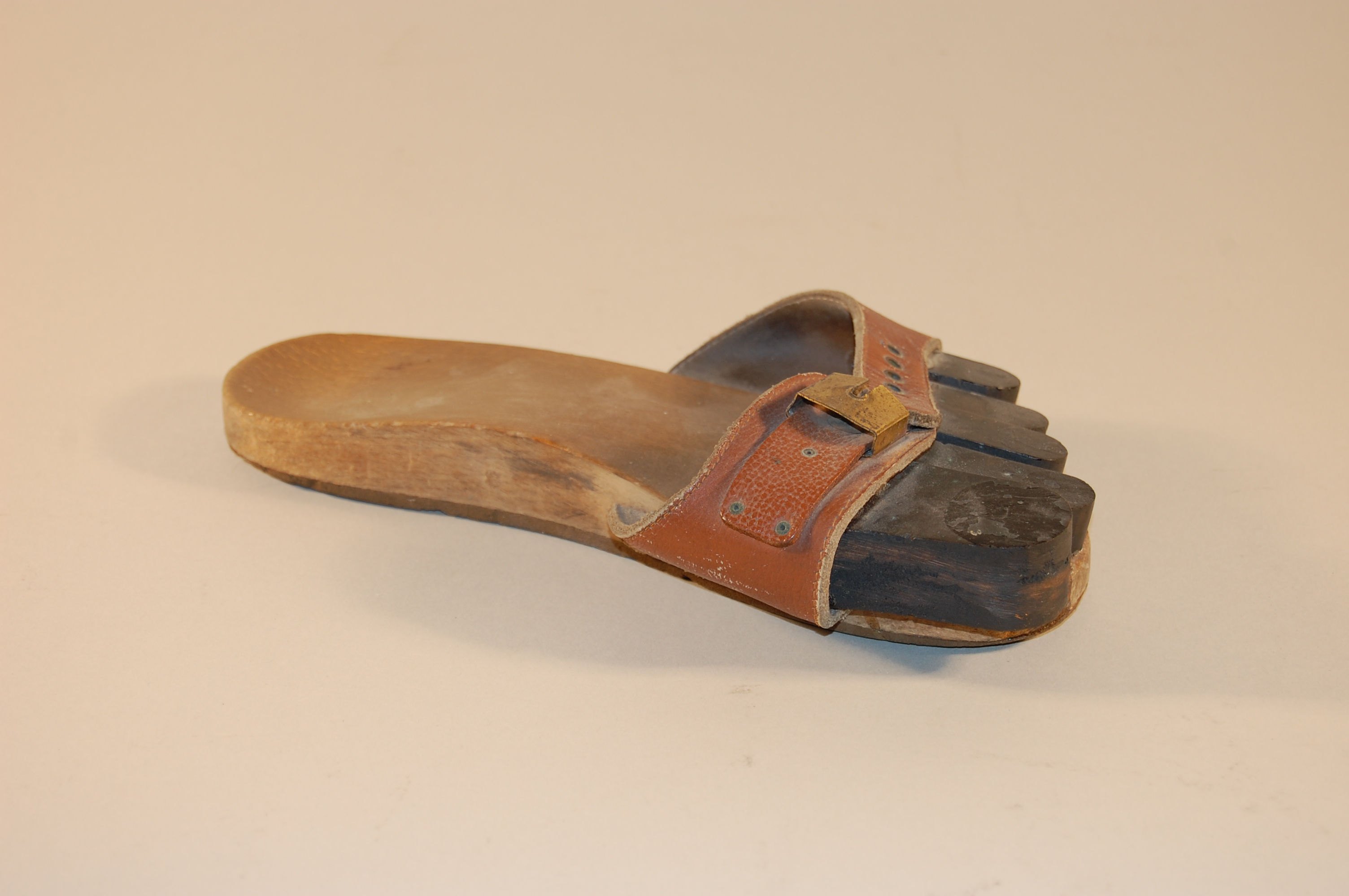 Description: A set of wooden toes is attached to an old sandal. The red leather strap is detached from its metal enclosure, allowing the strap to loosen to accommodate the five dark grey wooden shapes that represent toes. The toes extend from under the leather strap until the tip of the sandal. The large toe and pinky toe extend off the sides beyond the sole of the sandal. Black paint on the largest toe represents a toenail.