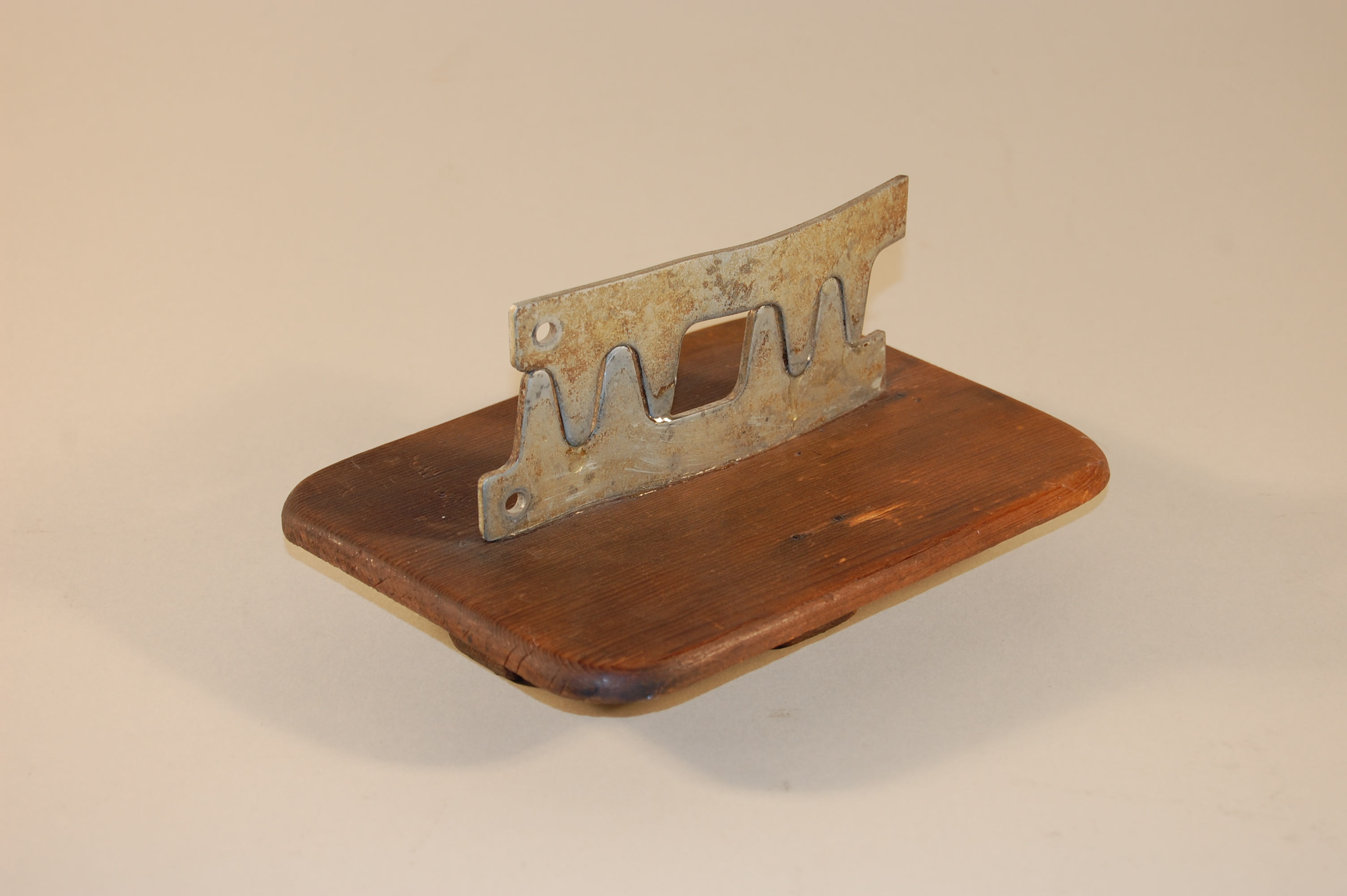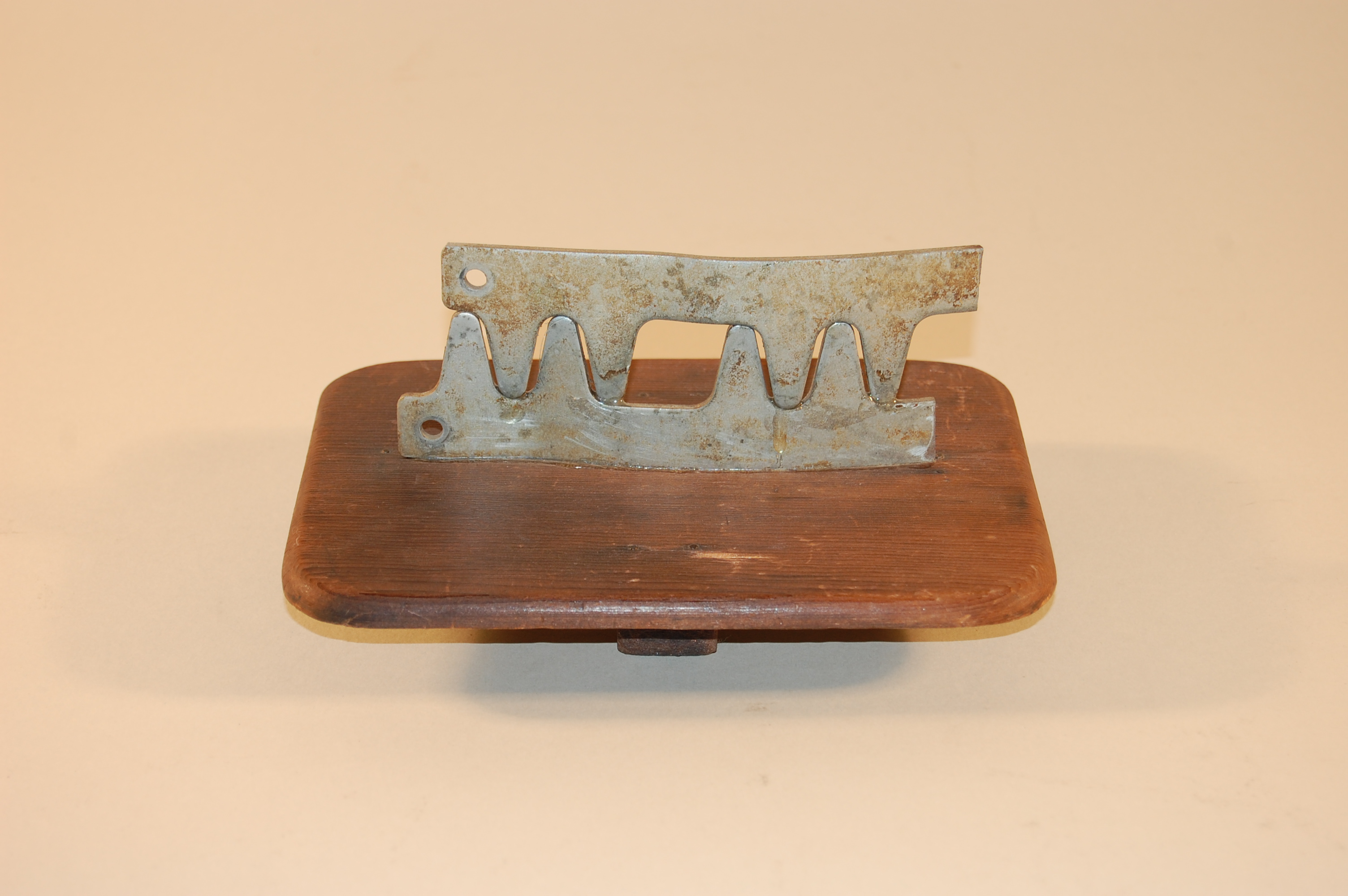 Description: Two identical serrated strips of metal are assembled one on top of the other to appear as one unified strip. Each strip has a hole on one of its ends, suggesting eyes, and a resemblance of teeth on one of its sides, directly under the eye holes. These details suggest an animal face. The second set of metal serrations represent their legs, which are interlocked. The base of this assemblage is a rectangular wooden pedestal with curved edges and four short wooden legs positioned near each edge.