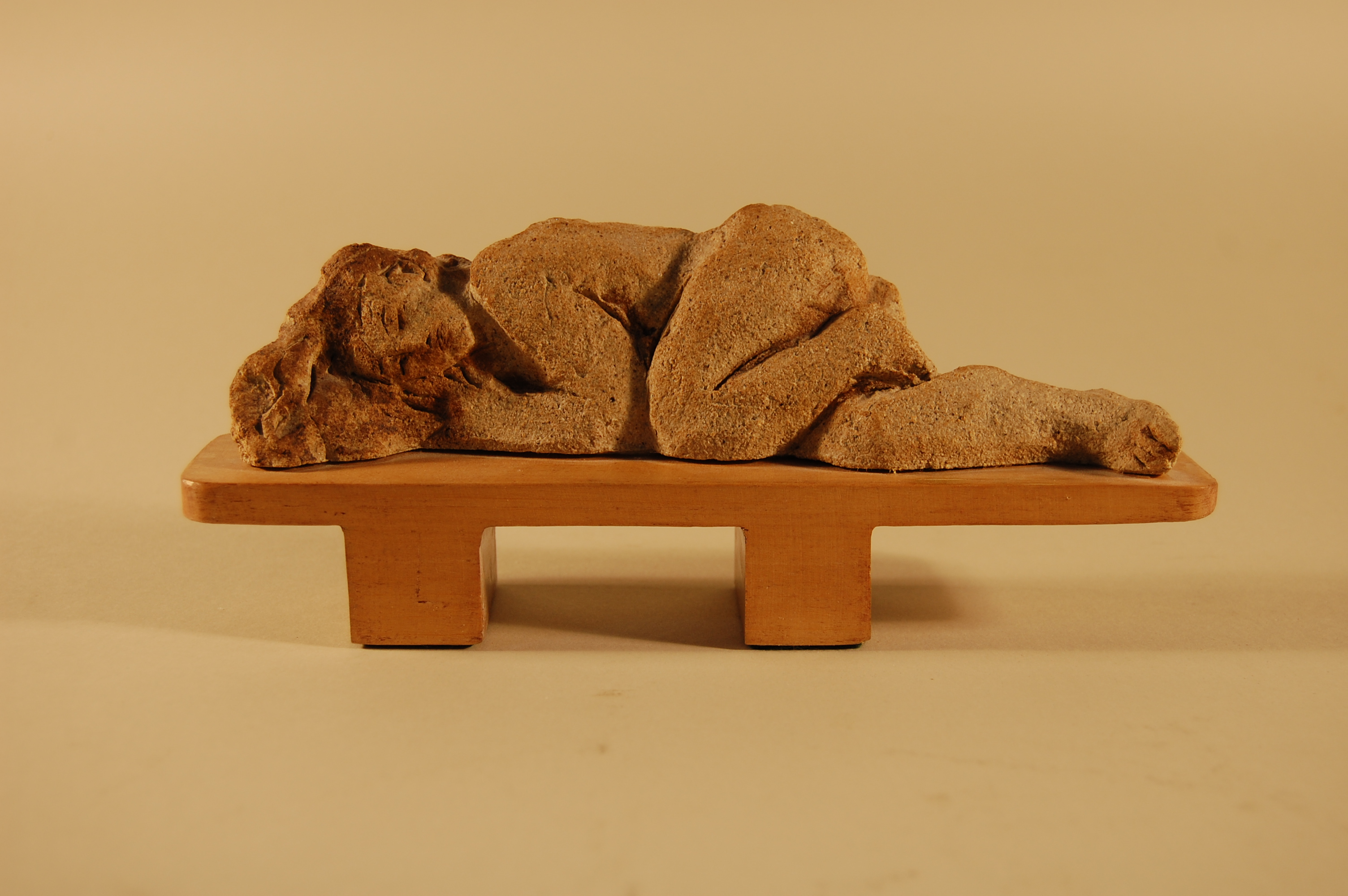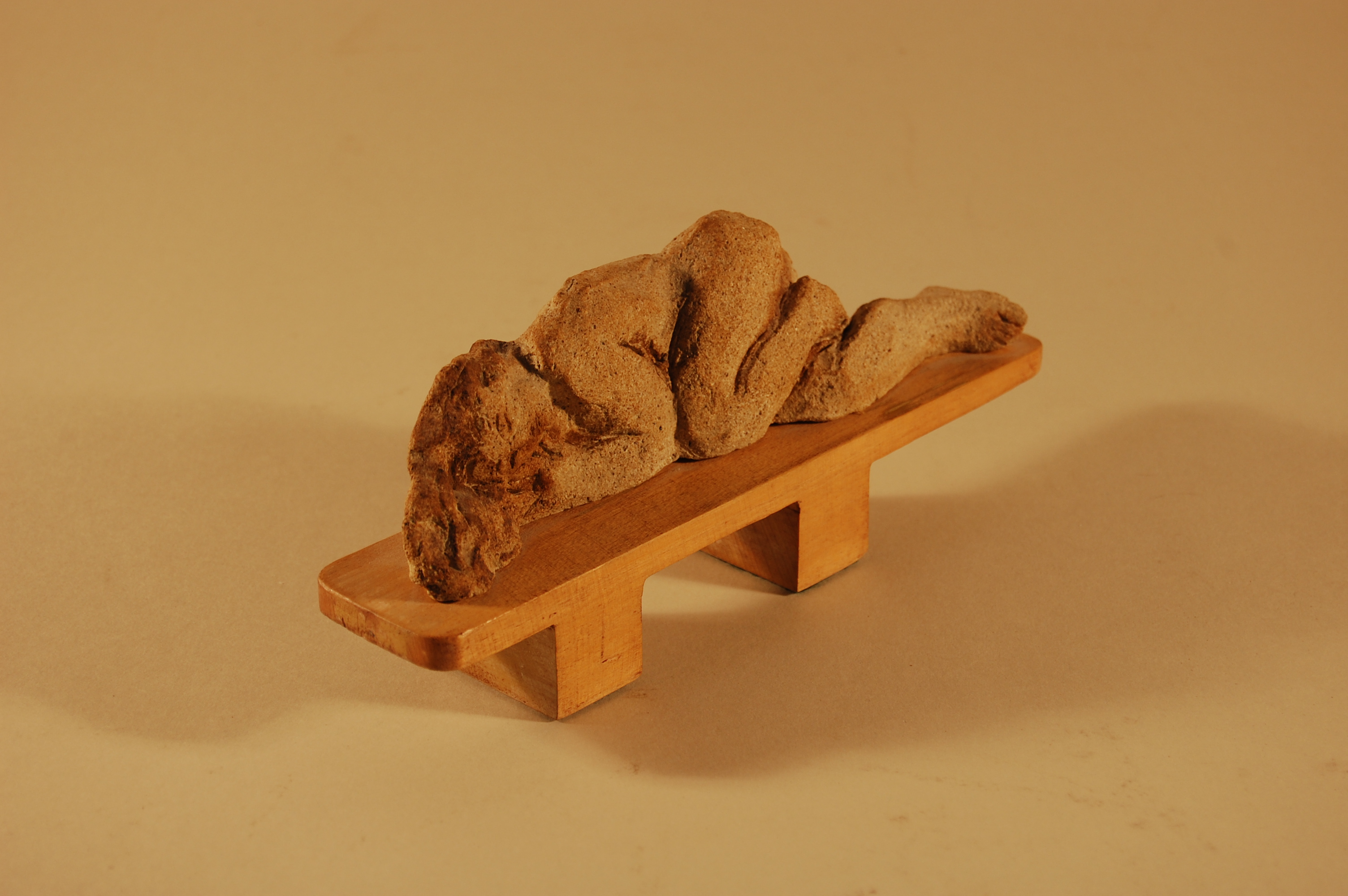 Description: A form of a nude woman sleeping on her right side is sculpted from clay, and attached to a wooden base with two legs that resembles a bench.