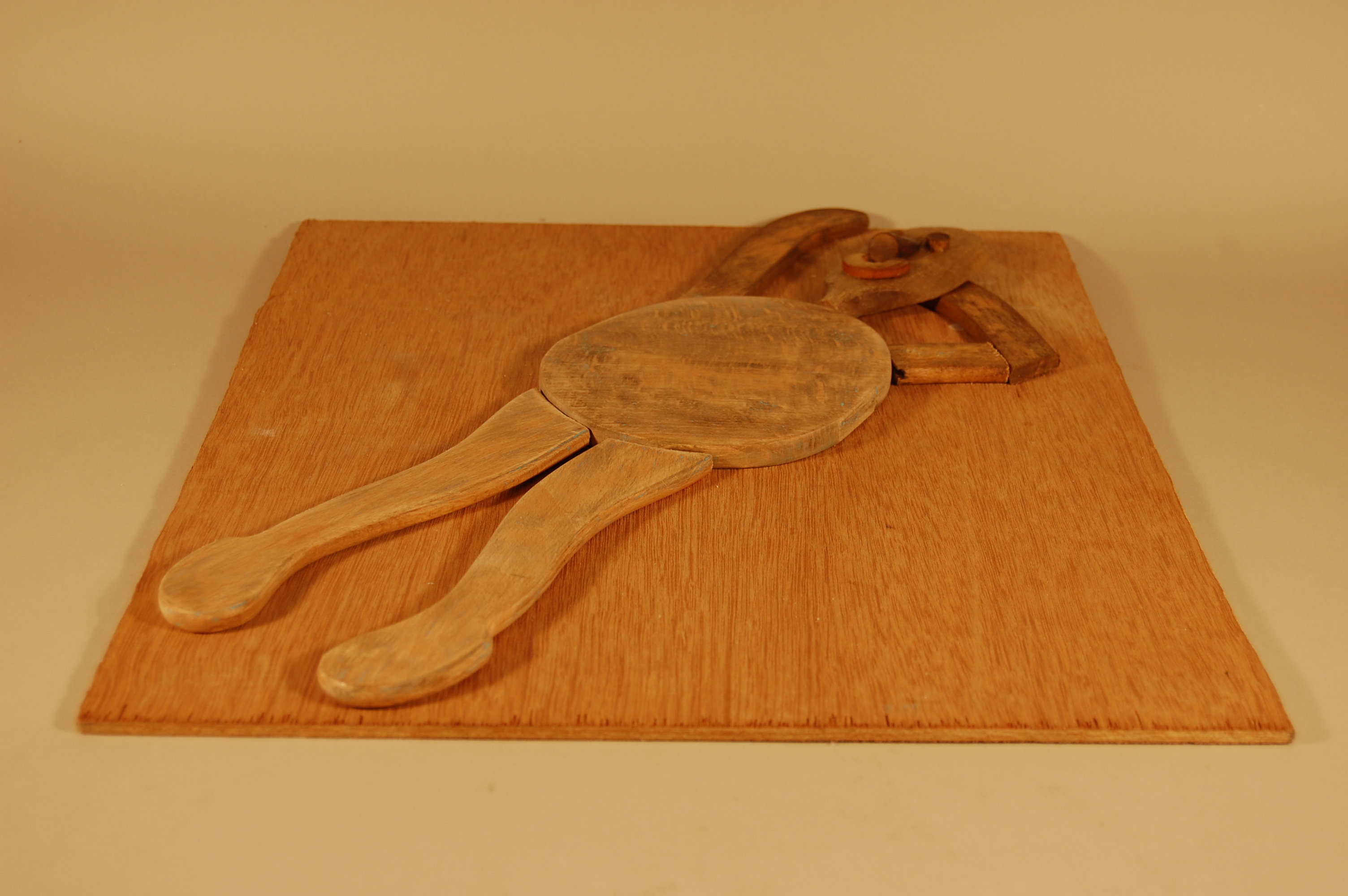 Description: The form of a reclined man is attached to a thin, wooden board. The man’s head and neck are represented with the bowl and neck of a wooden spoon. His facial features are made from small, wooden forms. Two wooden pegs represent his eyes, a cylindrical wooden form with a light red stain is inserted diagonally into his face to represent his nose, and a half doughnut-shape with a light red stain represents his smile. His torso is made from an egg shaped cutout of wood with remnants of a light blue stain. His limbs are made from wooden hangers. One side of a hanger forms each leg, and the tip of each hanger forms a foot. His arms are made from similar parts of smaller wooden hangers. His right arm extends parallel to his head, while the hanger representing his left arm is broken in half, representing a bent arm that is allowing his hand to rest behind his head.