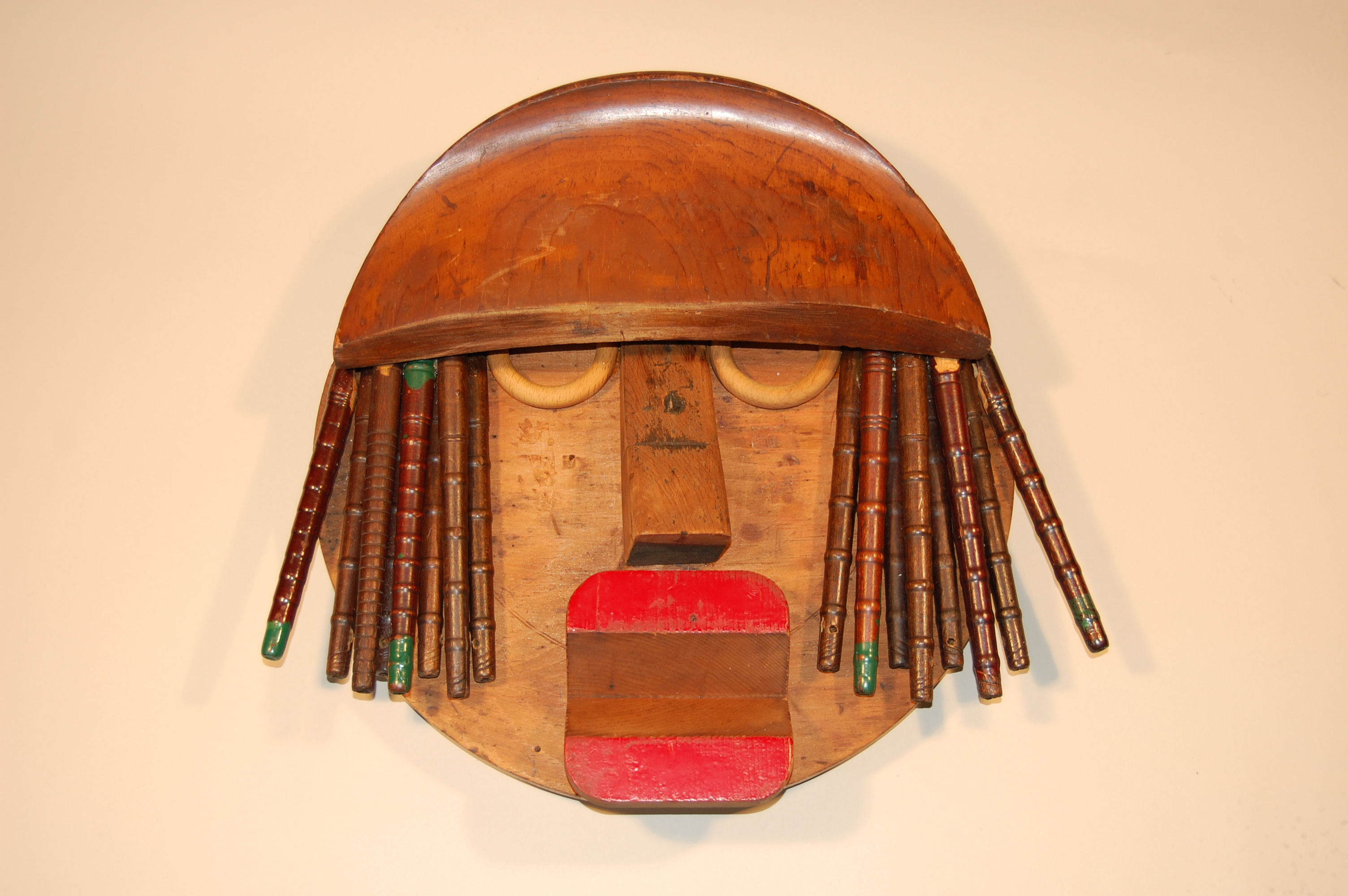 Description: The face of a Rastafarian man is represented by a series of wooden forms attached to a round wooden shape that serves as the base of this wall-hanging piece. This man has a Rastafarian hair-do, with dread-locks represented by two bunches of wooden spindles that project in a vertically splayed manner from either side of his cap. Some of the spindles have small applications of green paint. Protruding from his face is a wooden form painted red representing his lips, as well as a slightly curved triangular wooden form representing his nose. His eyes are represented using two thin wooden rings. The rings are partially covered by a wooden half-circle, representing the cap on his head, which extends down to the mid-point of his eyes.