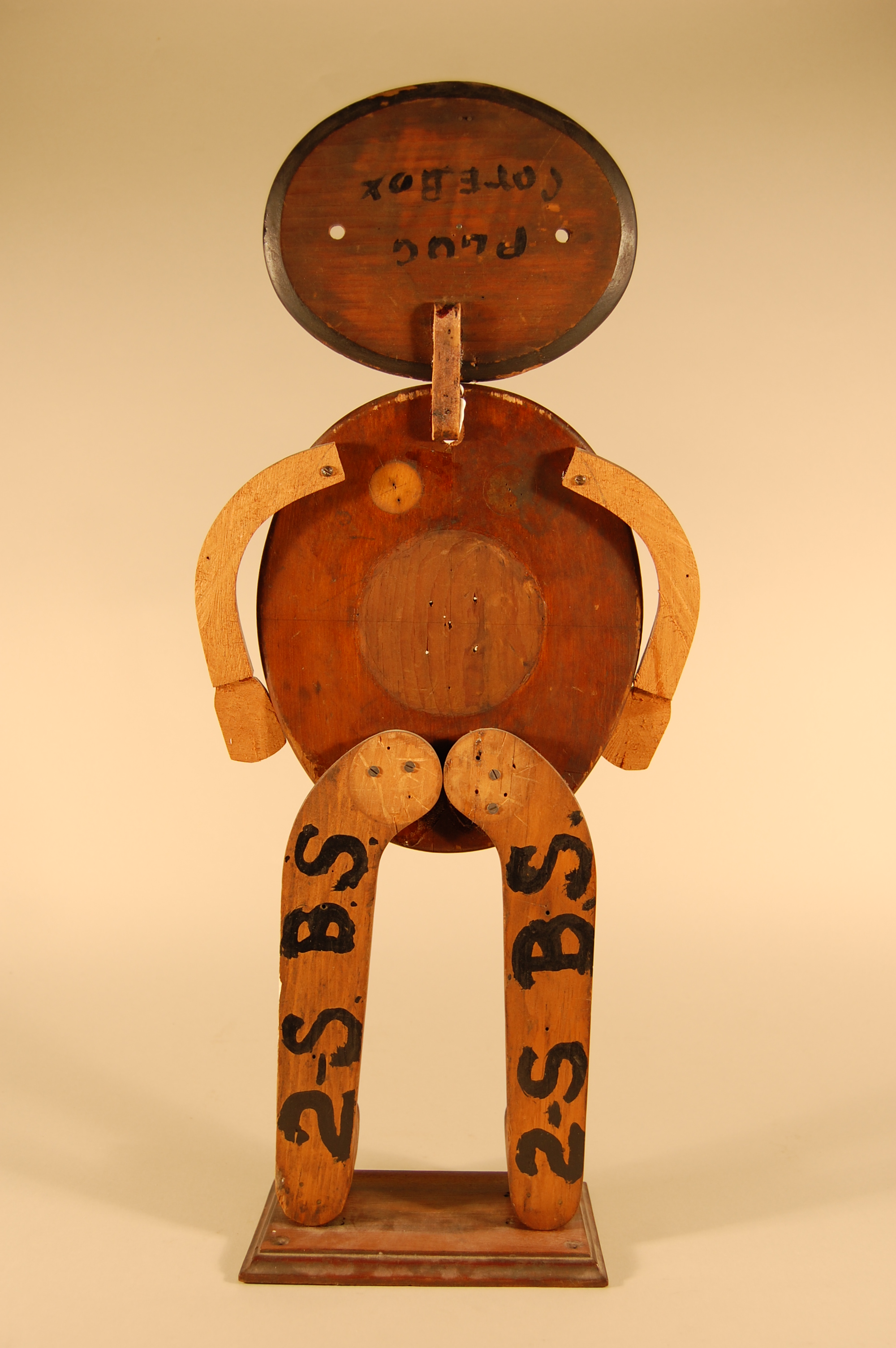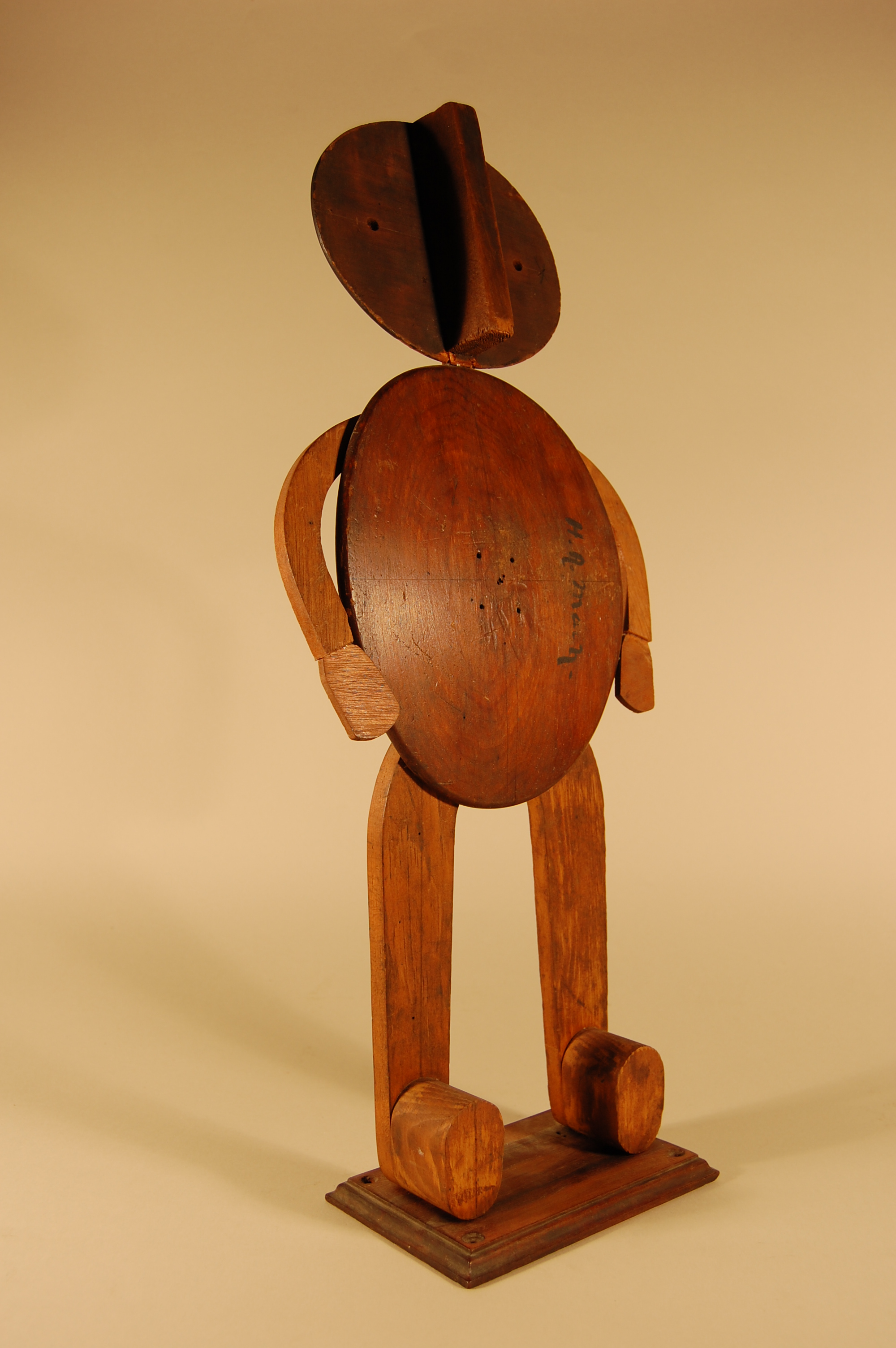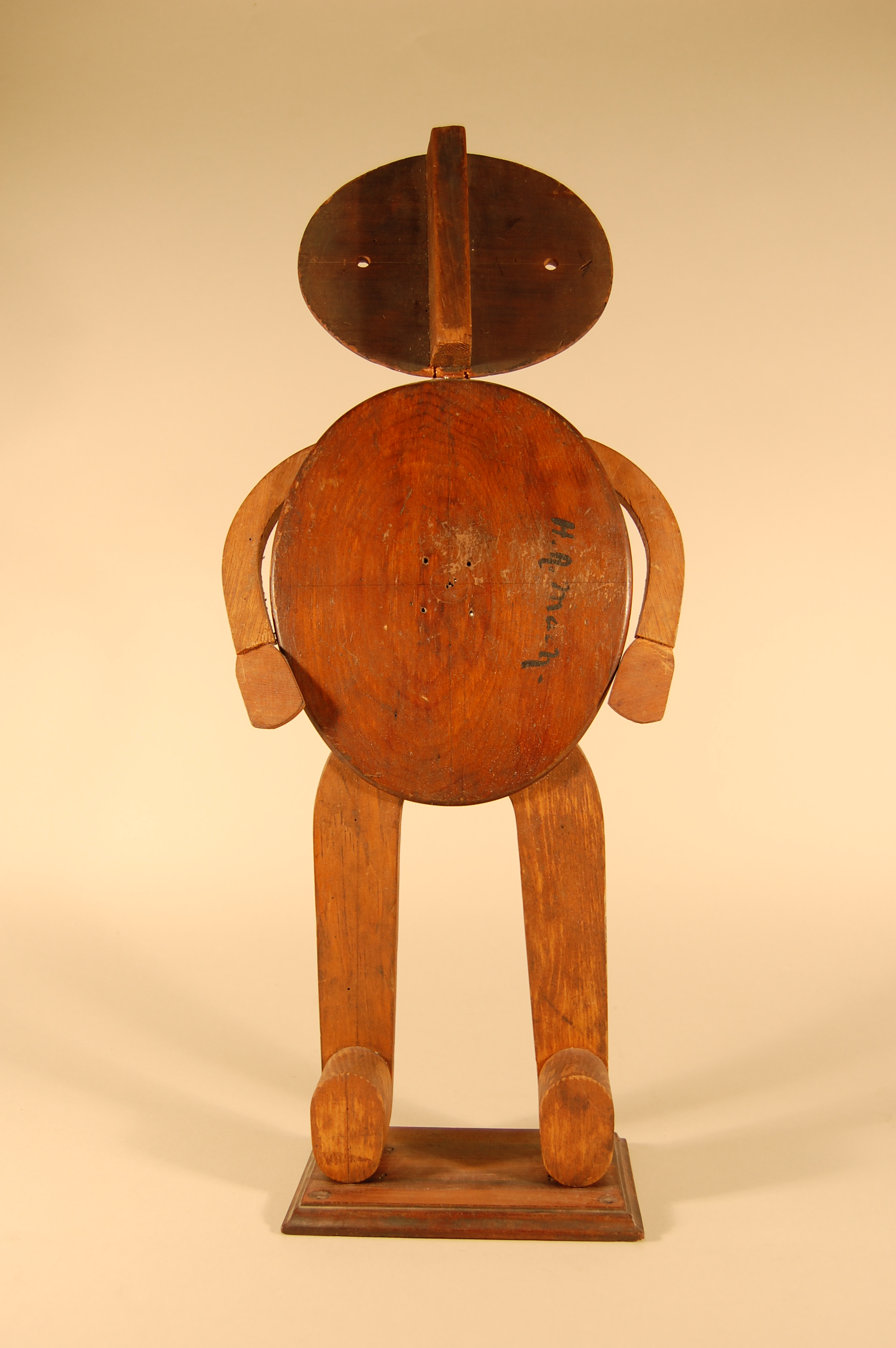 Description: A figure stands on a small, thin rectangular wooden pedestal. A slightly curved, wooden, vertical oval represents his torso, its slight curve projecting toward the viewer. A small inscription that reads: “H.A. Mach” is painted onto the right side of his torso in black paint. His arms and legs are represented with wooden forms. His hands and feet are represented with oval wooden forms. An original inscription: “2-S B.S.” appears in large letters in black paint on the reverse side of both legs. A horizontal, oval wooden form represents his head. Two small pre-existing holes represent his eyes. Another original inscription is included in black paint on the reverse side of his head (“PLUG CORE BOX”). A rectangular wooden form extends vertically across the center of his head, representing his nose.