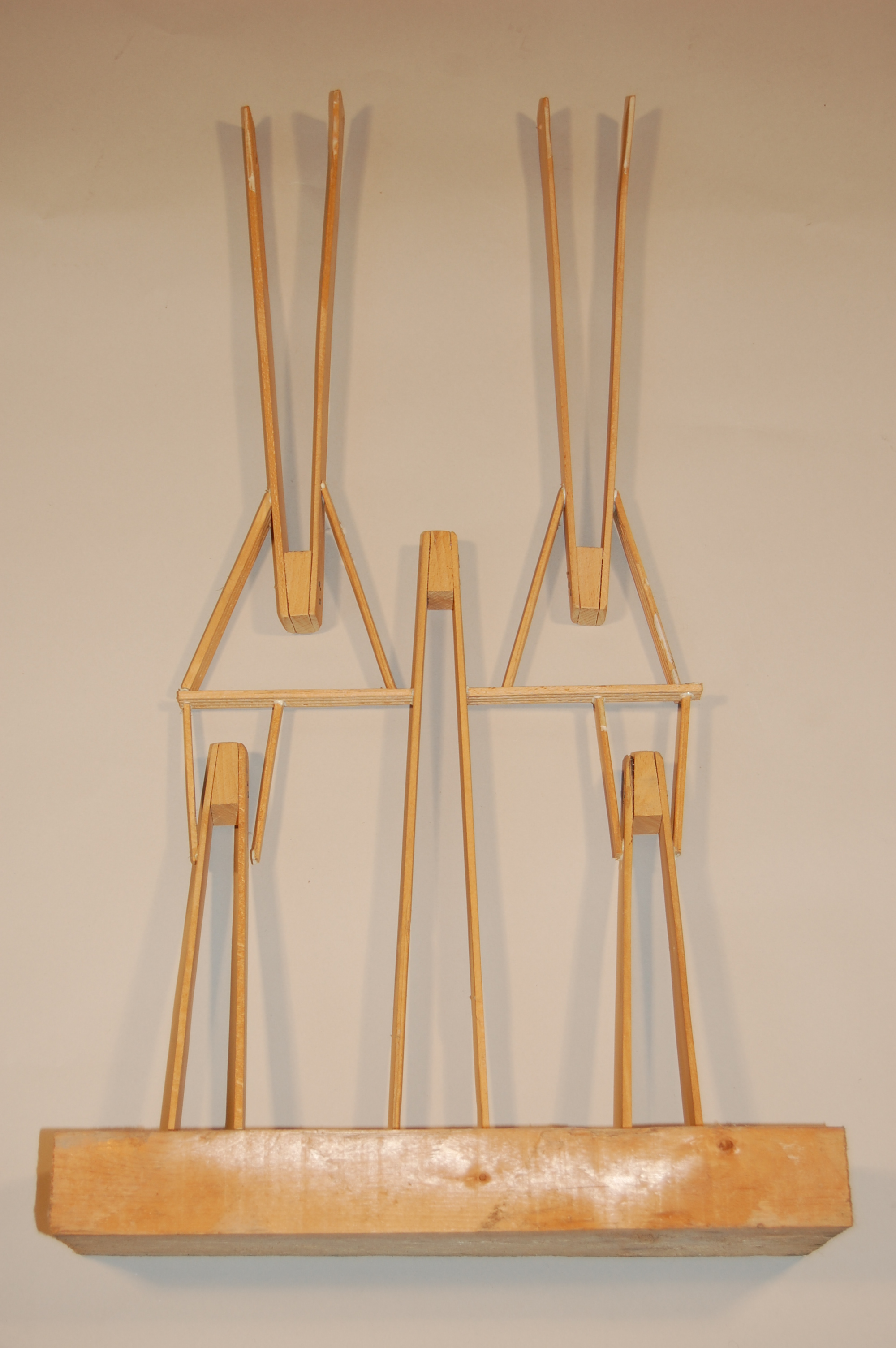 Description: On a rectangular wooden block are five acrobatic figures. The figures are represented similarly by wooden shapes. Legs of wooden tongs represent legs that extend from each quadrangular-shaped wooden head to form a triangle . Shortened legs of wooden tongs extend from the top portion of each set of legs, representing arms. The largest figure of the five is in the center of the arrangement, with his arms extendeding horizontally to nearly span the width of the wooden base. Two smaller acrobats stand below the large, central acrobat’s arms with their arms raised in a triangular shape above their heads, touching the large acrobat’s arms. Above the large, central acrobat are two figures of acrobats of medium size. They are positioned to nearly mirror the smaller acrobats below, as though they are performing handstands on top of the central acrobat’s arms.