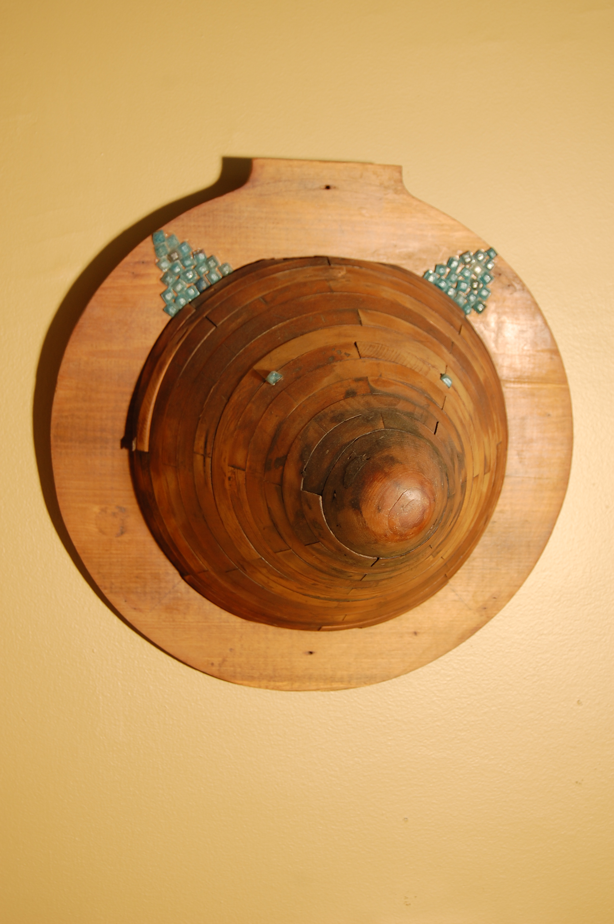 Description: This hanging piece is mounted onto a flat, round wooden disc. A wooden hat last in the shape of a cone extends outward from this base with its point projecting towards the viewer. The wider area of the cone represents the boar’s head, which narrows to a tip, representing the boar’s snout. Two blue Italian glass mosaic tiles represent eyes. Two clusters of these tiles form triangular shapes on the base of this piece where the base meets the hat last, representing the boar’s ears.