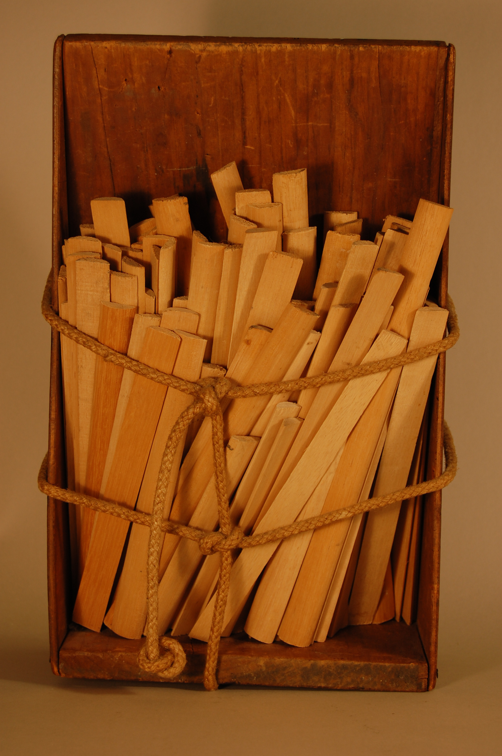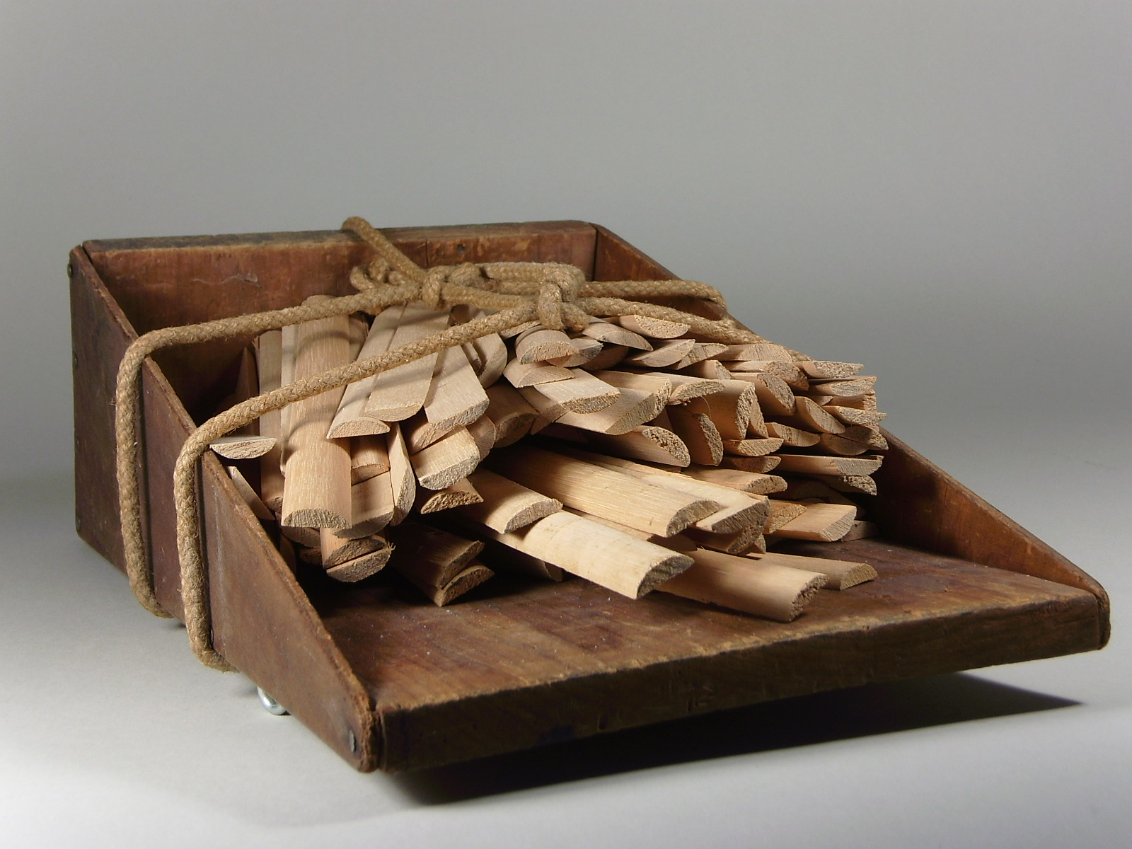 Description: Split wooden sticks of various heights are secured in a wooden tray. The tray has a bottom edge and sloping, triangular sides. Two rings of knotted rope appear to secure the bundle of sticks in the tray. Together, the sticks represent a mass of humanity tightly bound together into a single working unit; each individual pronounced and yet unified.