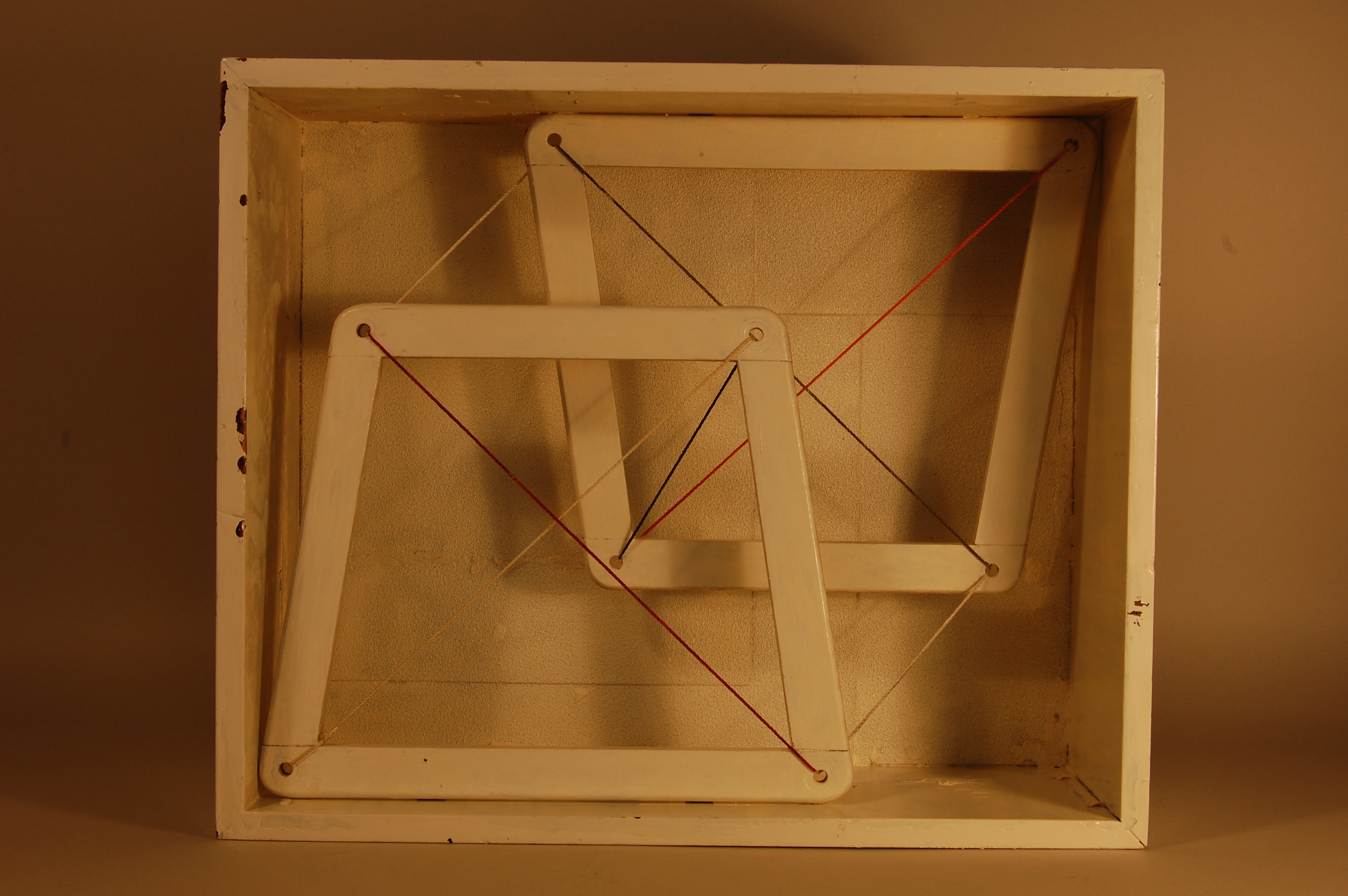 Description: A wooden box painted glossy white contains a formation of two wooden, painted white, trapezoidal tennis racket presses. Each tennis racket press’ longest side is attached to one of the longer sides of the rectangular box. The presses do not touch the back of the box, creating an impression of floating. White string is threaded through the hole in each of the corners of the tennis racket presses. This string extends across each individual press, as well as between the two presses, creating a design of taut diagonal lines. Two segments of the string are painted red and two are painted black.
