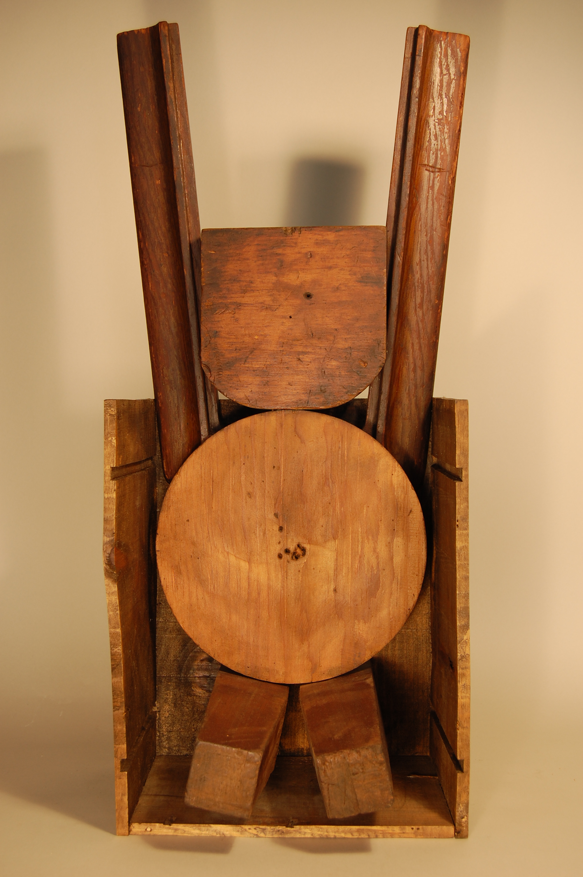 Description: A partial wine crate holds the abstracted form of a man. One side of the crate has been removed to allow the man’s form to extend beyond the confines of the box. A disc of wood represents his torso. His legs, represented by two identical thin, rectangular blocks of wood, project perpendicularly from his torso, so that he appears seated. Two long pieces of wooden trim project upward at a slight angle away from his head, representing raised arms. His head, located between these two planks, is represented by a square piece of wood with rounded bottom corners. While the man appears to be sitting in the box, his body is attached to the back of the box and does not actually touch the bottom. He appears to float within the box.