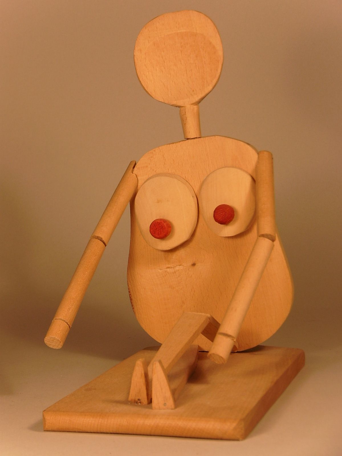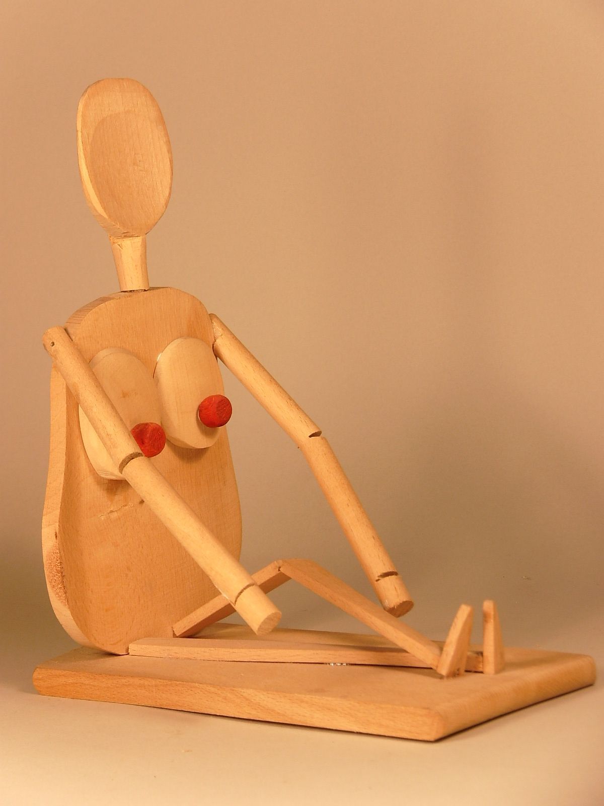 Description: A stylized, seated woman stretches her limbs. She sits on a thin, rectangular wood base. Her arms and legs are made of cylindrical pieces of wood nailed together in the locations of limbs’ joints. Her right leg is extended in front of her and her left leg is crossed over her right leg. Her arms are extended forward. Her head is represented by a circular piece of wood, that is carved slightly inward. A cylindrical piece of wood attaches her head to her torso. Her torso is represented by a pear-shaped piece of wood. Her breasts are represented by two circular pieces of wood glued onto the torso. Each breast is accented with a wooden bead stained pink, representing the nipple. On the reverse side, strokes of a pen connote her backside.