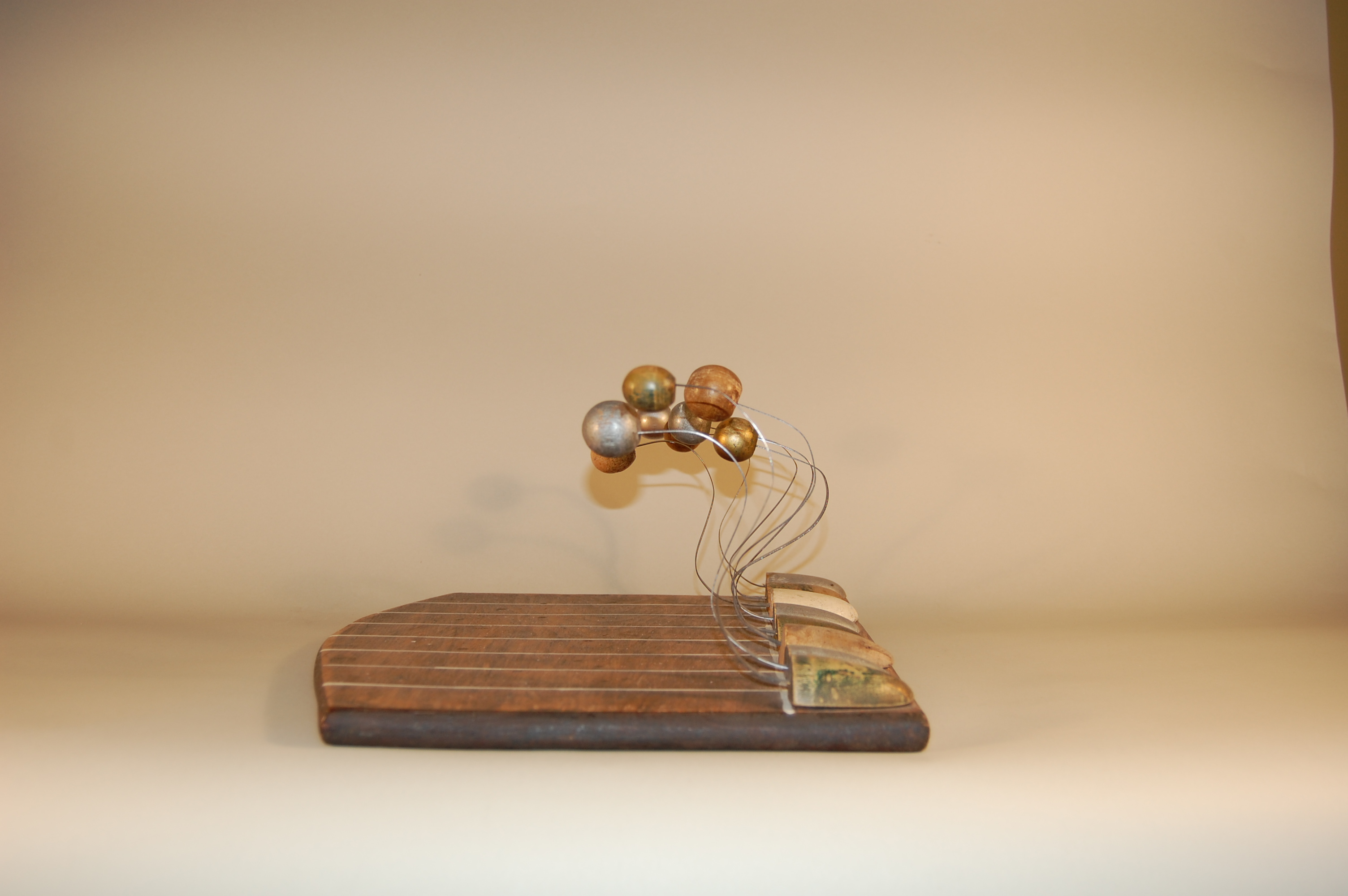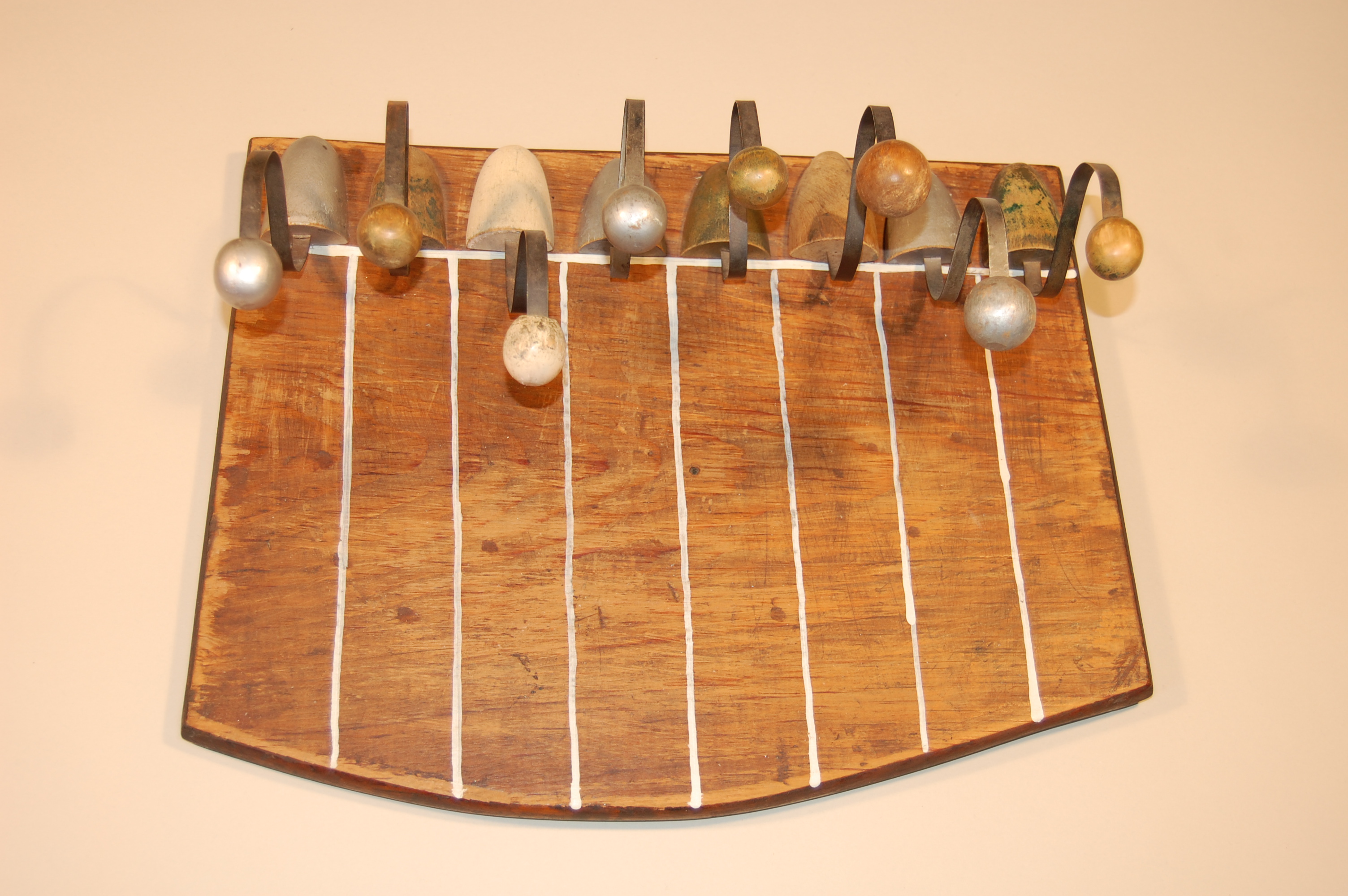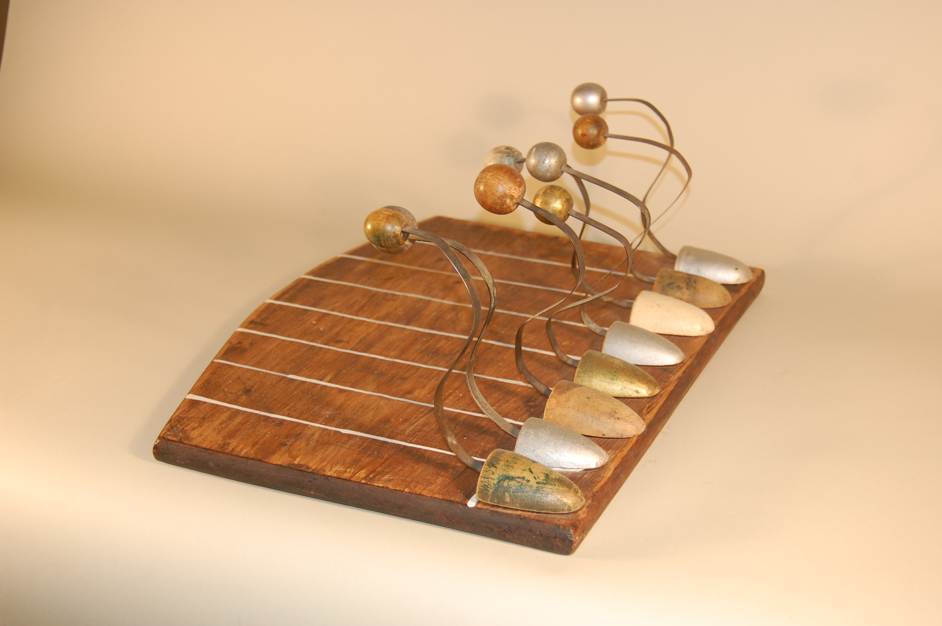 Description: A rectangular wooden board with one rounded side represents the racetrack. Seven white lines are painted across the narrower side of the board to represent the different racing lanes allocated to the racers. The racers are lined-up side-by-side along the side of the board that is across from the rounded side. These racers, represented by women’s shoehorns, appear as though they are running because their heads, the balls on the backs of the shoehorns, bobble forward and back. The curved metal, which allows them to bobble, is attached to the front of the shoehorn that represents their bodies.