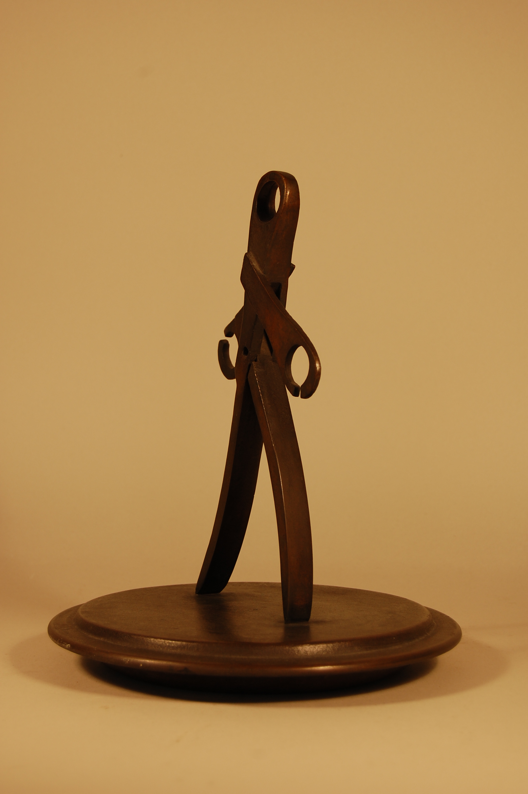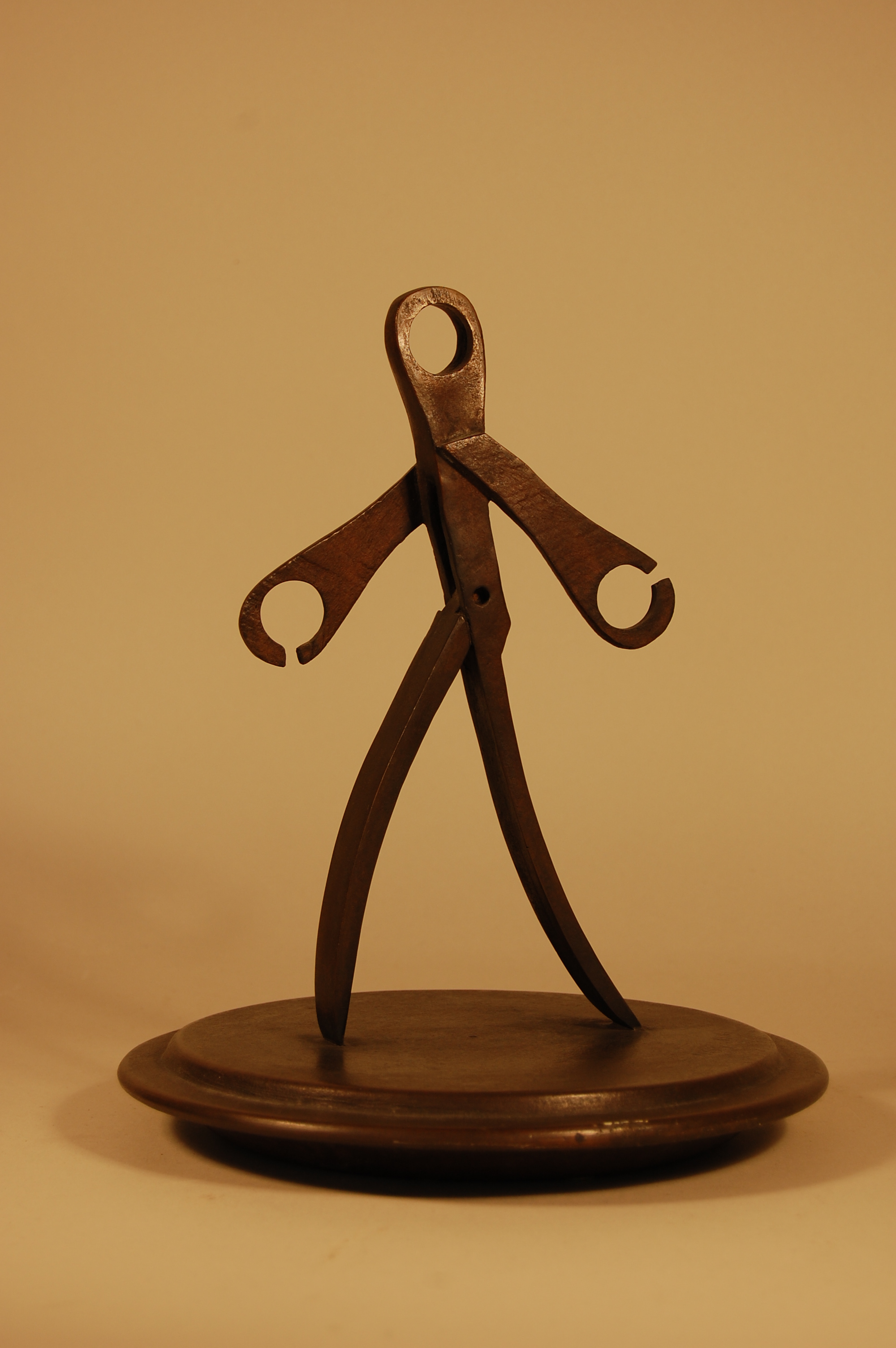 Description: A stylized man walks on a round, bronze base. The rounded tong handle represents his head, while the parted tong legs represent the man’s legs. His arms and hands are made from the other tong handle, which is split horizontally in half and then attached to the lower register of the other tong handle. A small segment of each hand is removed, representing fingers.