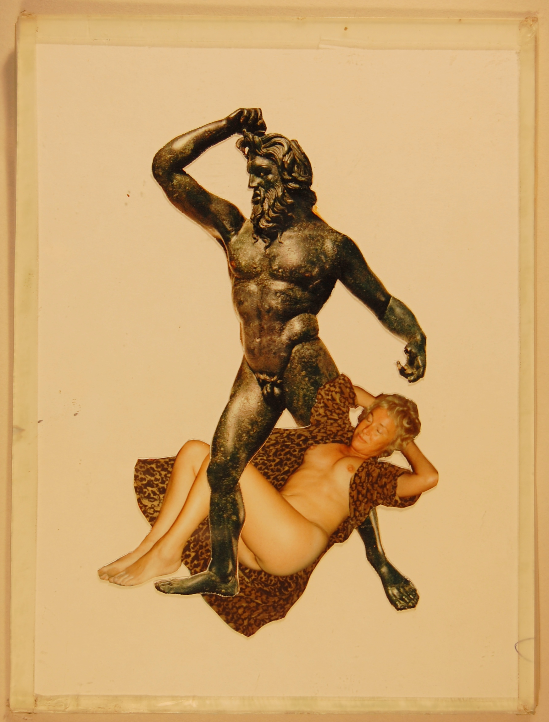 Description: A nude woman in a leopard print robe lies between the legs of a bronze statue (artist unidentified).