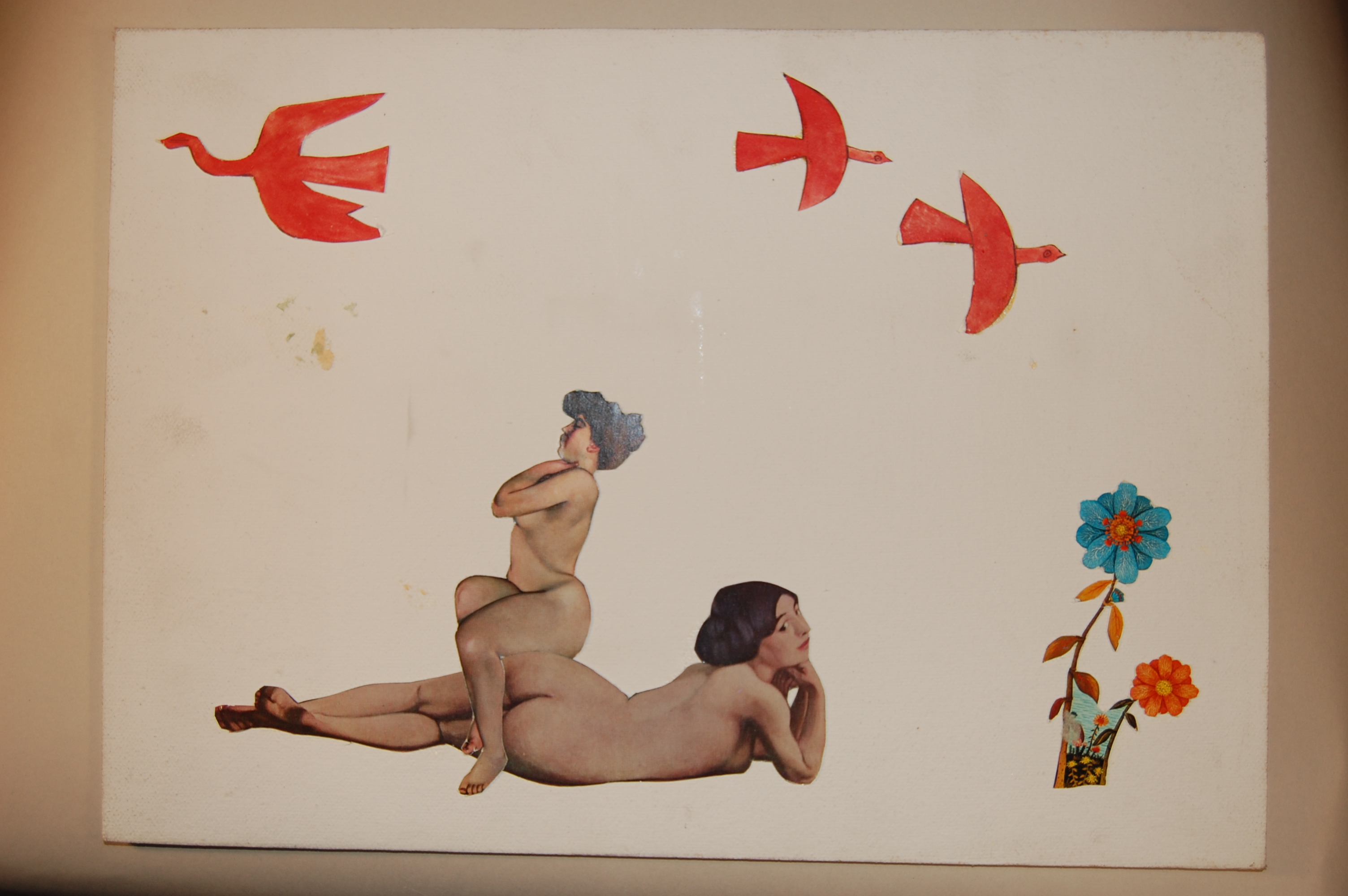 Description: Cutouts of two nude women, a pair of flowers, and three red birds are pasted onto a white canvas. The smaller nude woman sits on the larger, reclined woman’s hip. The flowers are pasted to the right of the two women. Three red birds fly overhead.